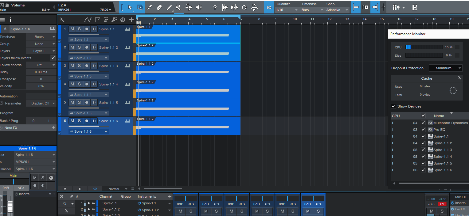 @almazmusic, Комп i7 3770K 16Gb, Win 10x64 Pro, карта RME Baby (1), буфер 64, Studio One 4.1.3 dropout protection установлен на минимум, c твоим пресетом тянет 6 Spire 1.1.14 с загрузкой ASIO на 86%, тресков нет. Больше добавлять не стал, дело в твоей системе. У меня в Reason 10.2 аналогично твоему Spire ведет себя его собрат ReSpire, который может одним патчем положить ASIO на лопатки, тот же Spire на том же пресете при этом пляшет где-то в районе 10-15%