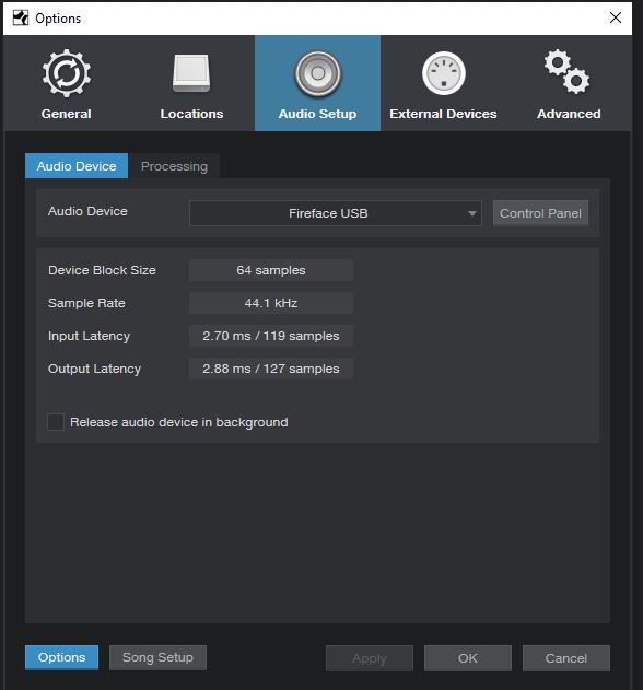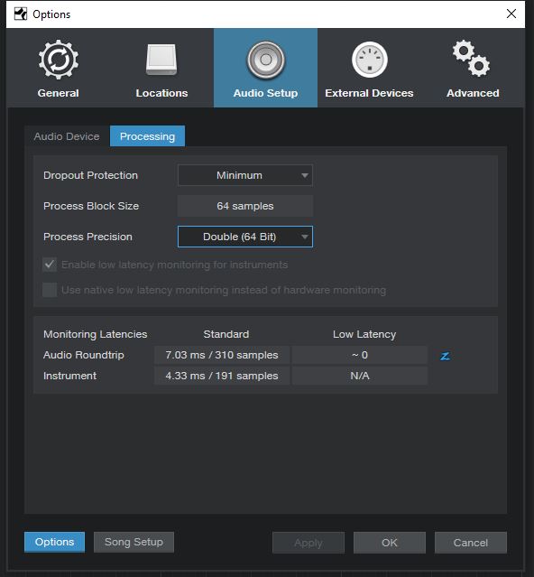 64 буфер не в аудио девайсах случайно? Потому что это на запись, а процессинг - это на обработку. И я сильно сомневаюсь, что 3770 может вытащить 6 спаеров на 16-голосную полифонию с зажатыми 32 нотами (для рестарта огибающих), по 4 осца с 9-голосным унисоном ибо это получается: 9*4*16*6 = 3456 голосов. Я сильно сомневаюсь, что что-то вообще способно вытащить такое кол-во голосов.