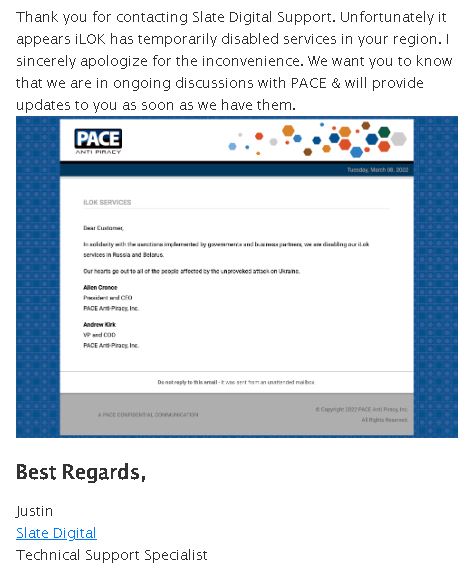 В самом начале СВО, ILOK отключил мне облачный сервис с ключами и прислал мне письмо с проклятиями. Я обратился к разработчику софта и с вопросами как быть в таком случае? На что мне ответили что это недоразумение произошло лишь по прихоти ILOK и сейчас все будет улажено. Вскоре все заработало.