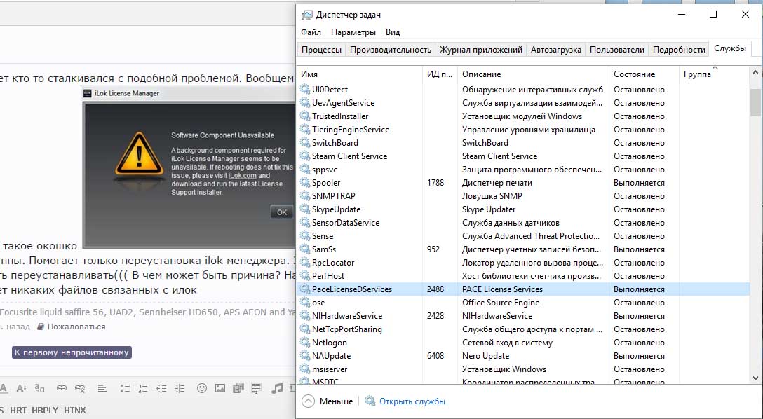 Естесственно все плагины на ilok в DAW недоступны. Помогает только переустановка ilok менеджера. Затем спустя 1-2 дня ситуация повторяется и нужно опять переустанавливать((( В чем может быть причина? На компе стоит касперский, но в его карантине нет никаких файлов связанных с илокВключайте службу в диспетчере задачДрузья, может кто то сталкивался с подобной проблемой. Вообщем недавно при запуске ilok менеджера стало выскакивать такое окошкоЕстесственно все плагины на ilok в DAW недоступны. Помогает только переустановка ilok менеджера. Затем спустя 1-2 дня ситуация повторяется и нужно опять переустанавливать((( В чем может быть причина? На компе стоит касперский, но в его карантине нет никаких файлов связанных с илок
