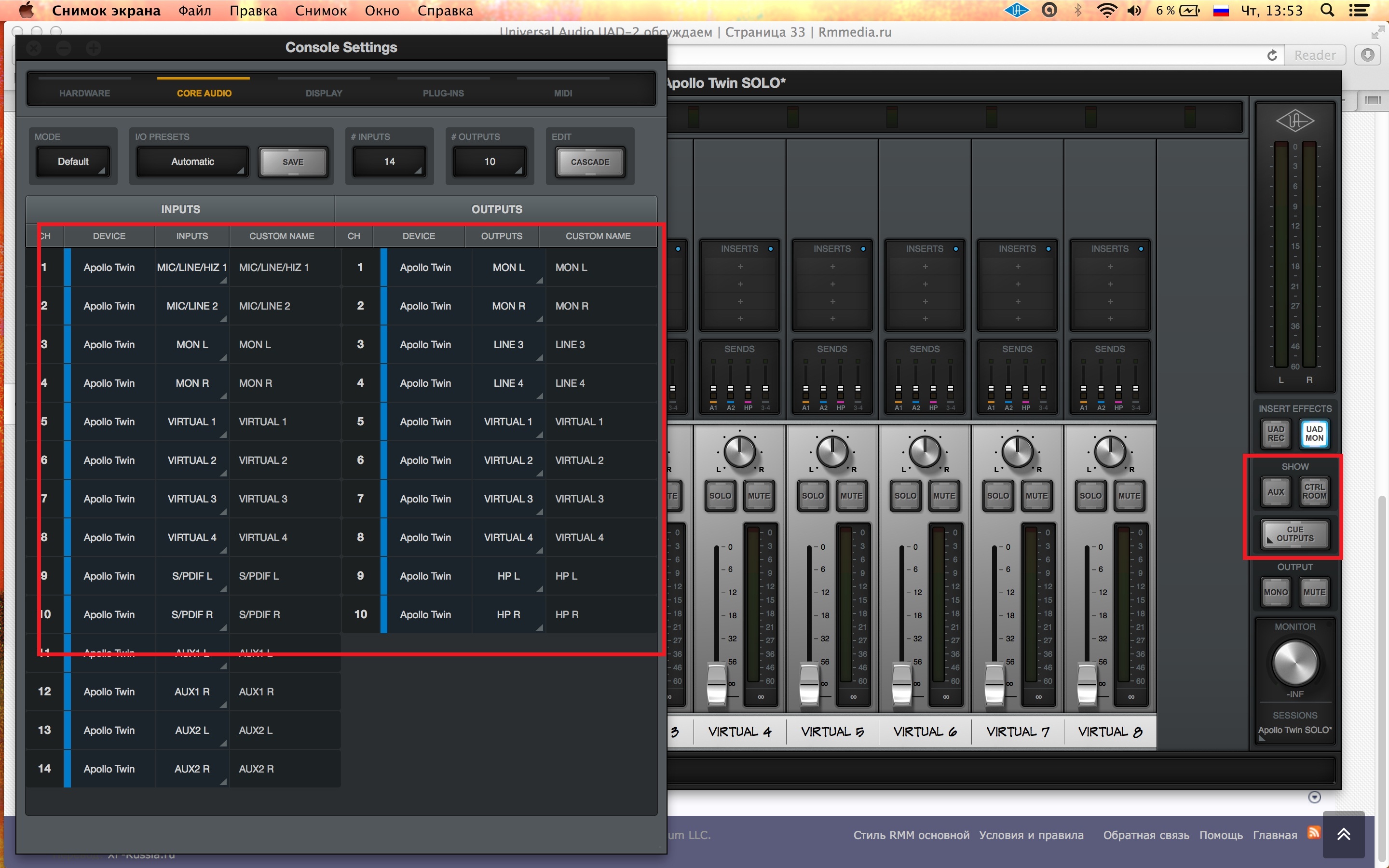 Виртуальная маршрутизация в консоли UAD осуществляется так же, как и в других DAW. Любой виртуальный вход можно сделать выходом, а чтобы его услышать достаточно послать его на наушники, мониторы (2-моно) или доп выход (2-моно).И как это их сконфигурить