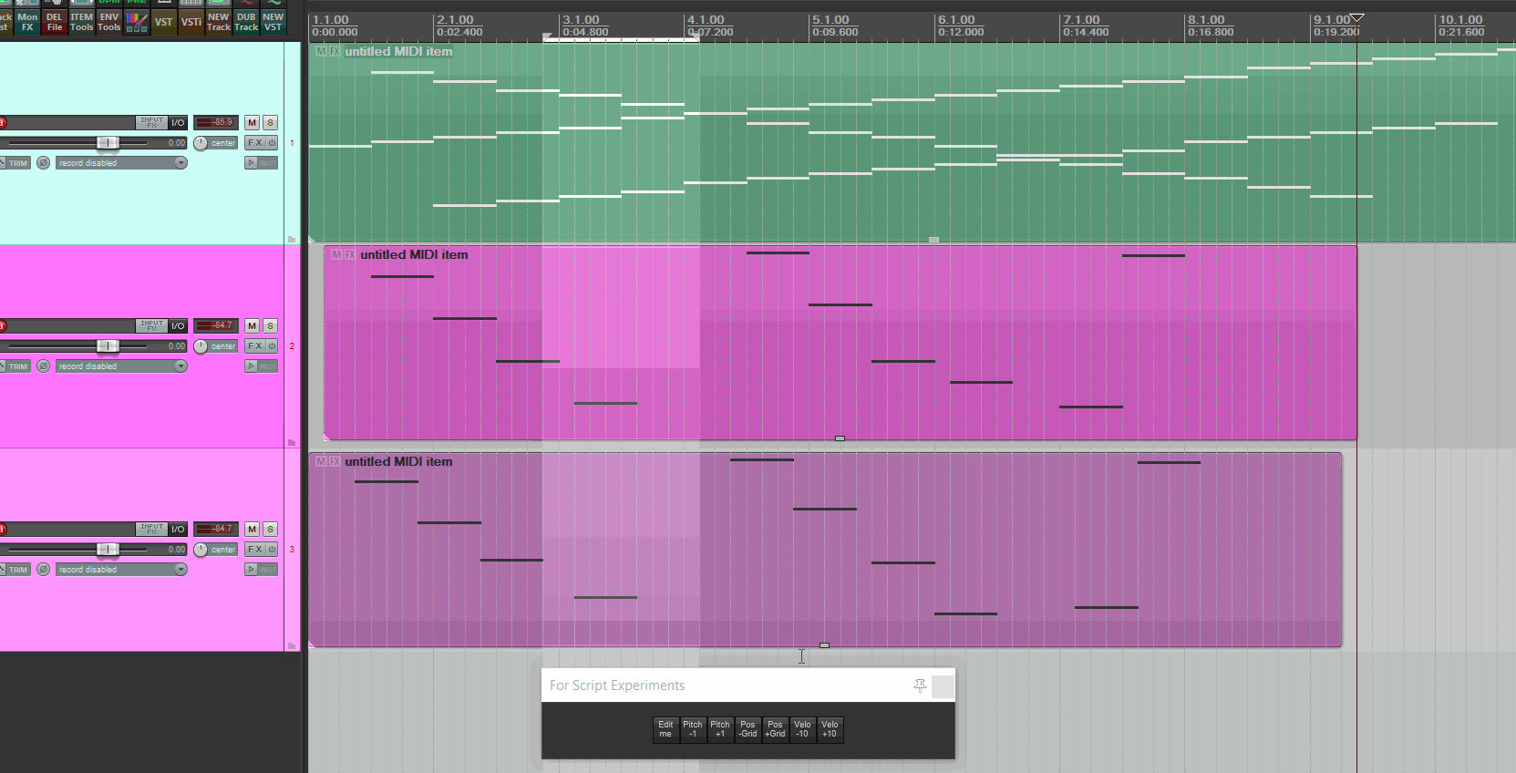 Скрипт,для транспонирования нот в выделенном айтеме в выделенном временном диапозоне вверх не заходя в МИДИ-редактор.Чтобы сделать вниз,в первой строке изменить 1 на -1.Для октавы- 12 и -12 и т.п.