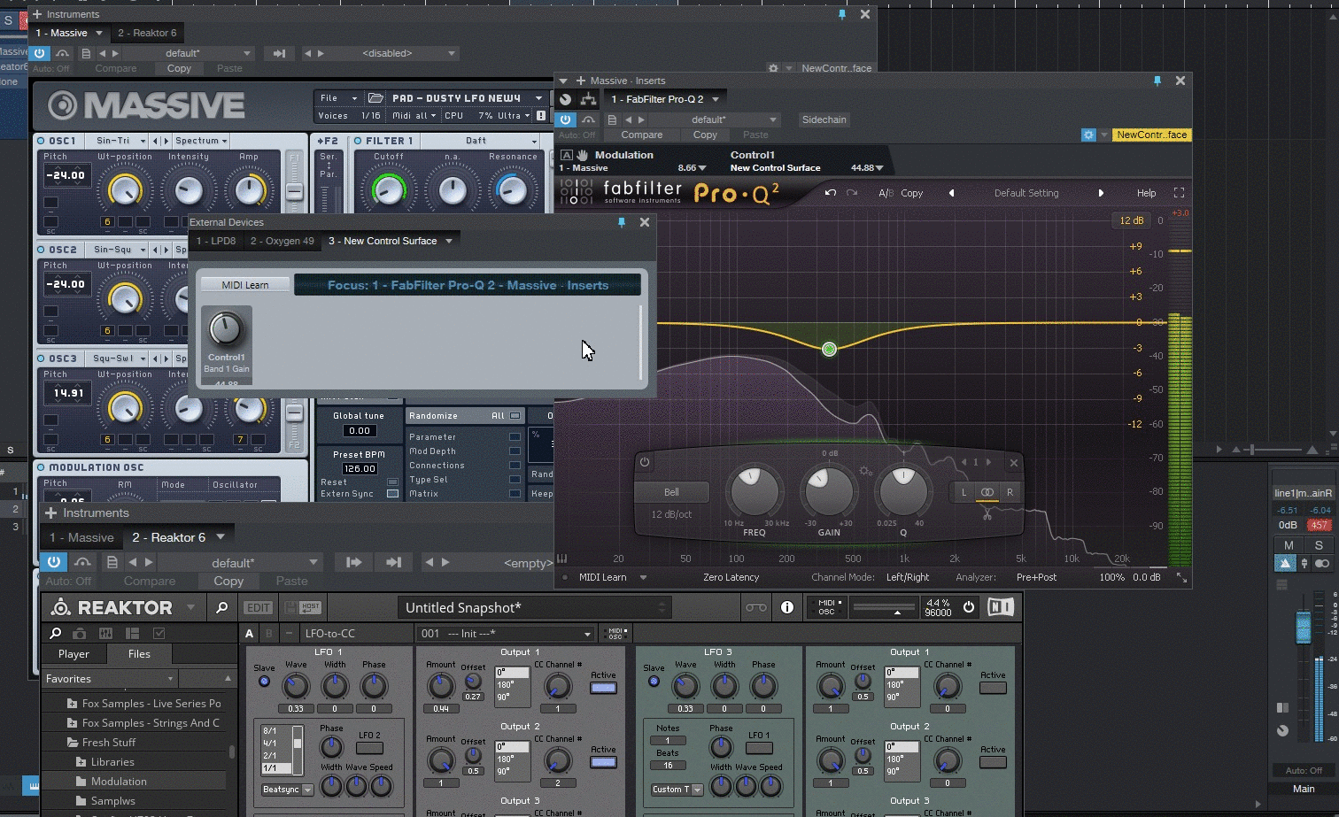 Получилось завести модуляцию эквалайзера через virtual midi порт и MidiShaper еще и отправить крутилки самого инструмента в LFO to CC в реакторе. Только пока что через один Midi Shaper получается модулировать лишь один параметр он просто переключается между выходами, а как выбрать несколько, не понимаю. Но все равно круто.