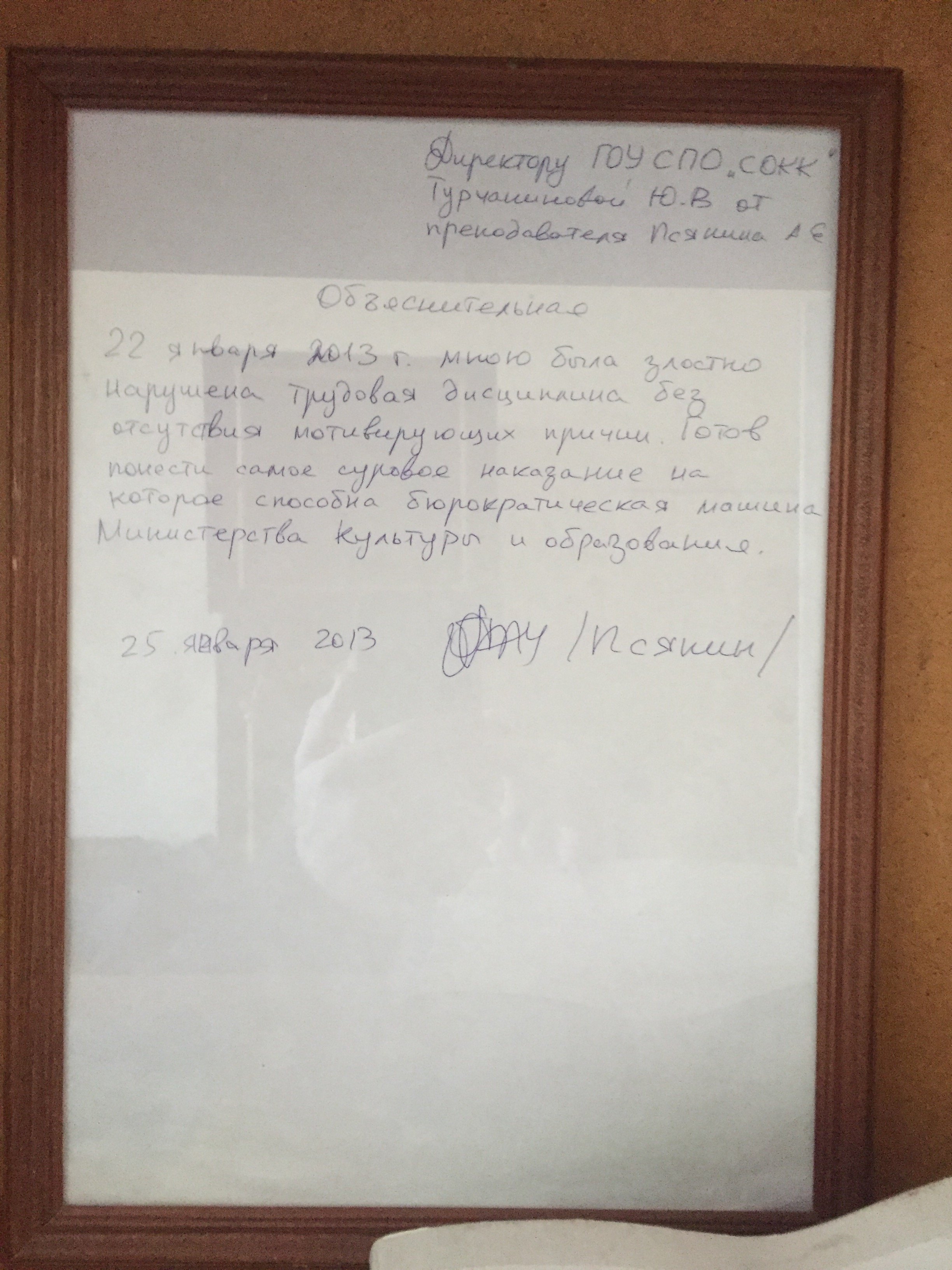 Мне сегодня скинули. Это моя реальная обьяснительная. Как они ее заимели интересно, теперь у них в рамке в училище висит