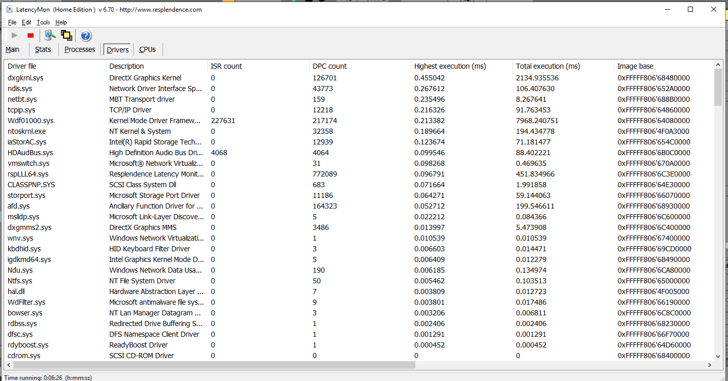 @Aleksandr Oleynik, спасибо! По Wdf01000 - это только программная проблема или что-то ещё в Биосе надо ковырять? И у меня ещё вопрос - могут ли все эти высокие значения Latency Monitor зависеть от настроек, например программ, которые идут с материнкой? У меня ASUS, и там в комплекте офигительная утилита, которая позволяет снижать скорость кулеров в PC. На температуру CPU результаты не влияют вроде бы, да и на скорость работы я особо не жаловался. У меня в DAW треска нет вообще, но при маленьких значениях ASIO буфера (например 64мс) частенько идут "дропауты". Становится некомфортным переключение пресетов в Spire или вовсе звук пропадает, например...