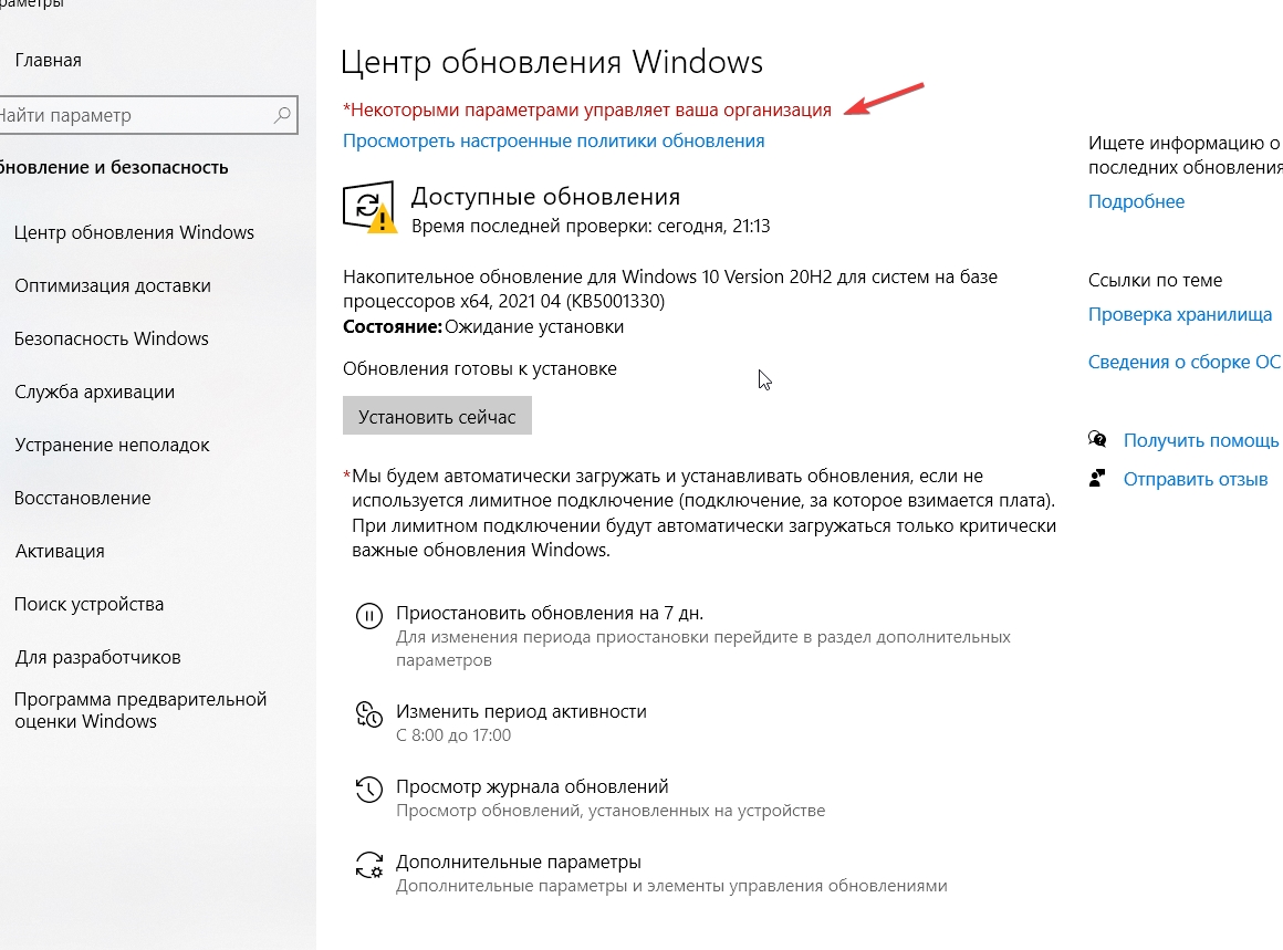 Сообщения "Некоторыми параметрами управляет ваша организация". Такое сообщение можно увидеть в меню «Обновление и безопасность», в Центре Windows Update и во многих других разделах. И это не значит, что ваш ПК контролируют другие люди. В случае с домашним компьютером (если он не подключен к корпоративной сети) «Организация» — не какая-то конкретная компания, которая управляет параметрами системы. Подобная формулировка подразумевает, что к определённым настройкам у вас нет доступа, и вы не сможете их изменить.