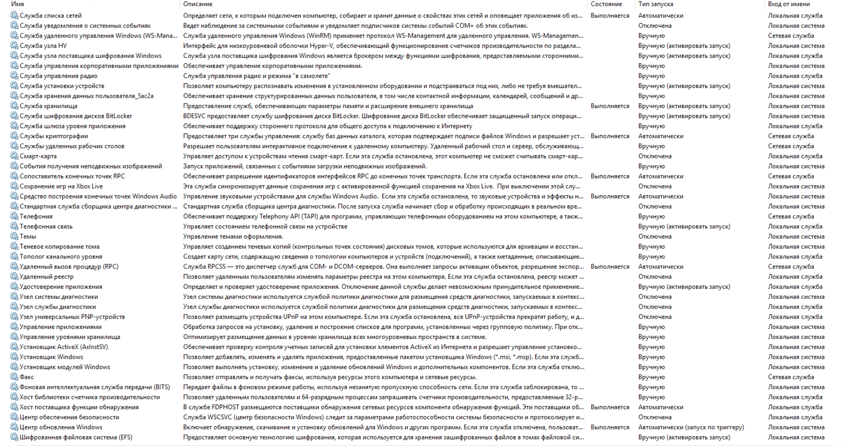 Старина, ты после включения служб комп перезапускаешь? Надо сделать, а то иные из них без перезапуска не включаются.
