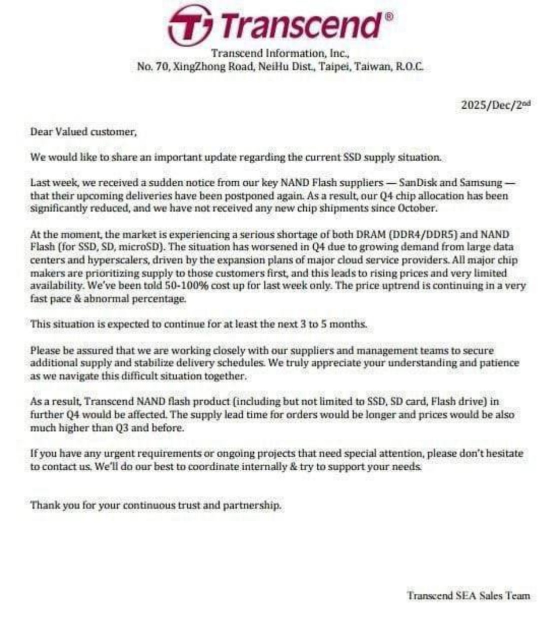 "Transcend приостанавливает поставки SSD-накопителей. Ключевая проблема заключается в том, что Transcend с октября не получает чипы NAND от Samsung и SanDisk."