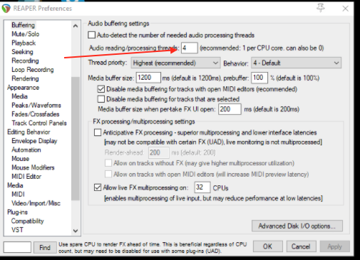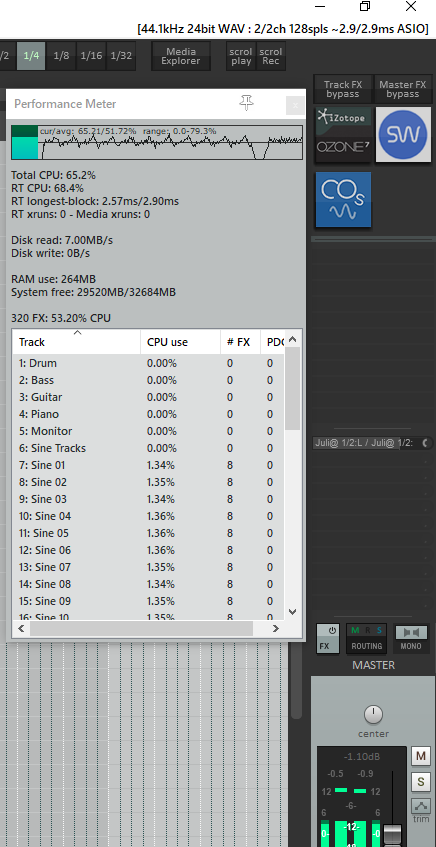 На RT CPU в Рипере также влияет изменение кол-ва потоков в настройке Allow live FX Multiprocessing, т.е. зависимость получается не только от производительности одного ядра.