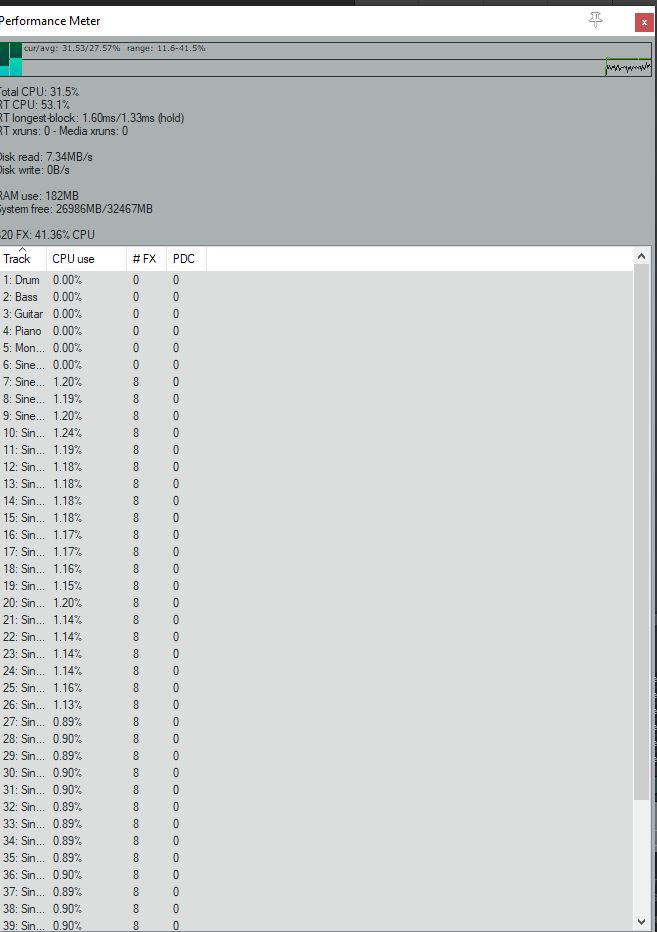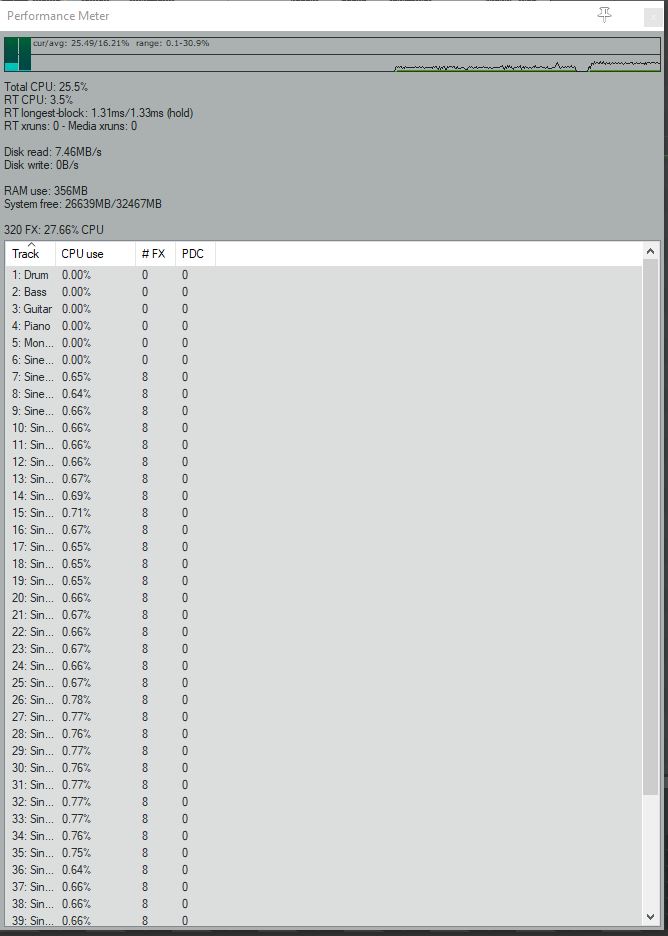 На этот раз один процессор, и кол-во треков не уменьшал (40 треков с плагинами)