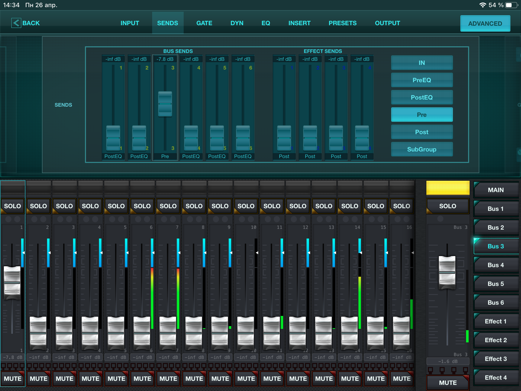 Коллеги, помогите, пожалуйста, советом. Вчера мне довелось первый раз порулить концерт на XR18 - пульт не мой, попросили подменить штатного звукорежа. Всё понравилось (вот только по эргономике - неудобно, если под рукой в быстром доступе нет фейдеров эффектов), но один момент я так и не понял/не успел победить - на мониторы (aux 1 и 2), а также в тюнер гитаристу (Aux 3) так и не удалось отправить сигнал до фейдера, только после. Управлялка штатная, прилагаю картинки (например, отправляю 1 канал на 3й аукс) - вроде все кнопки нужные нажаты. Как только мьютирую канал в зале - в мониках тоже пропадает.. Может быть из-за прошивки? она там древняя, 0.9, кажется. Но прошивать чужой пульт перед концертом не решились.. И ещё - подскажите логику работы страницы Routing/Aux sends - не очень понятно, на что влияют выбираемые справа режимы - на выделенное перекрестие или на всю строчку целиком? В мануале на эту тему ничего не нашёл.. Обошлись тем что есть, отгрыли нормально. Сейчас пульта под рукой уже нет, а разобраться хочется.