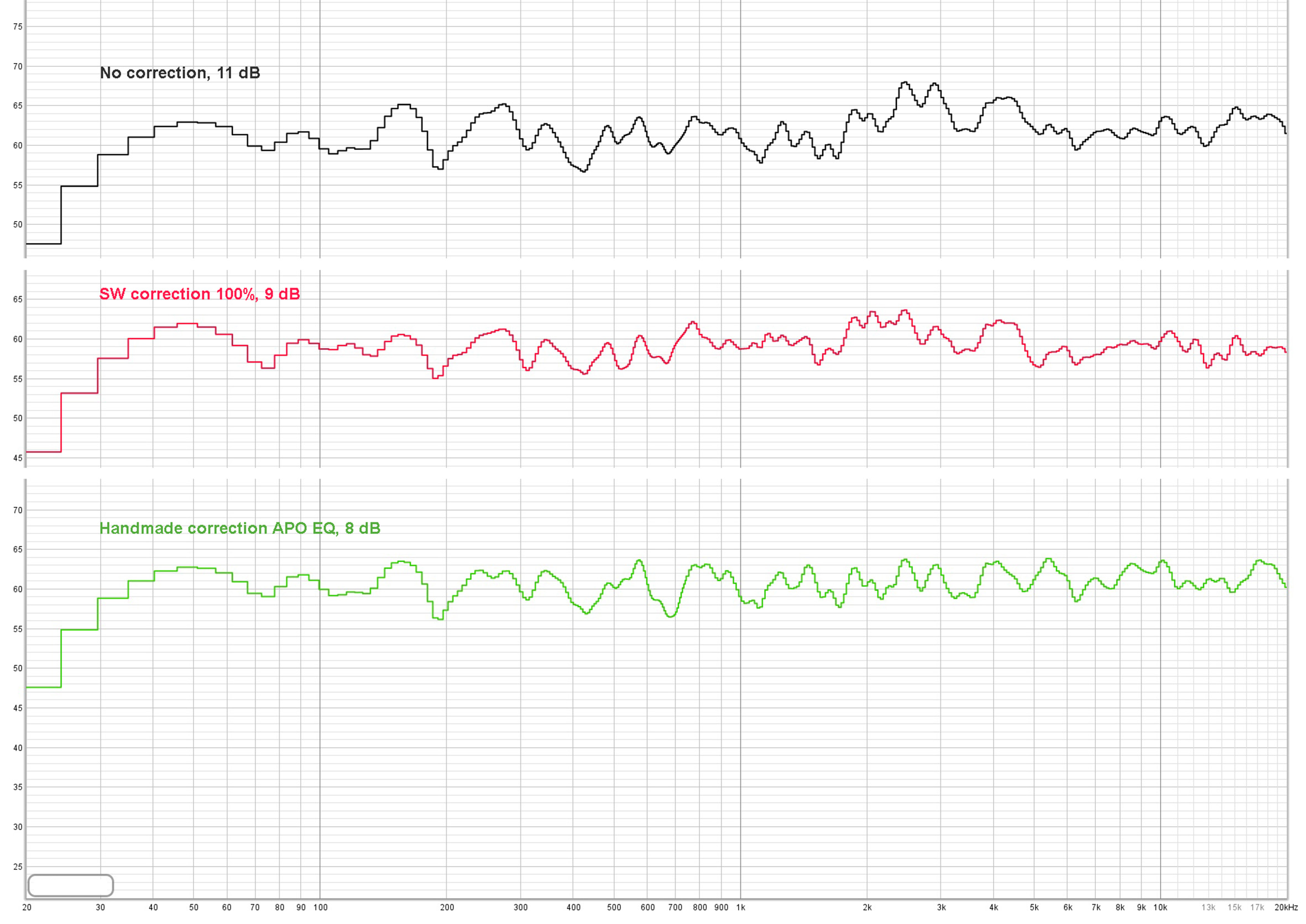 Это замеры в REW. Соответственно: без коррекции, с коррекцией Сонарворкс 100% (Normal 12 dB), с коррекцией вручную в APO EQ. В Дб указана неравномерность АЧХ.