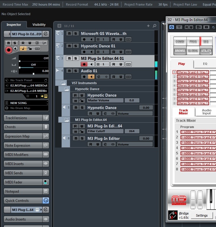 Кстати синтезатор тоже как и карта связан с компом по USB. но вряд ли в этом проблема. Почему по USB, а не МИДИ? Потому как железный М3 имеет свой программный плагин и редактор, потому здесь только подключение по USB. Конечно, можно по старинке прицепиться к карте миди-кабелями, но в таком случае, теряется возможность что то делать с М3Эдитором(програмным редактором и он еще идет как VST в КУБе). Микрофон еще можно как то запустить на аудио треке, если там нажать кнопку Монитор, но