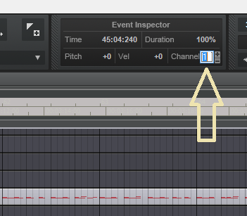 Выделить события на МИДИ треке и поменять канал тут, в Event Inspector