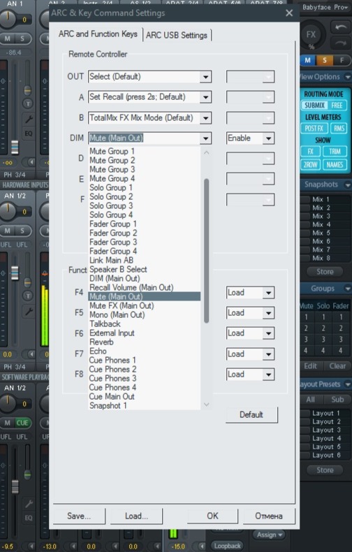 Разобрался с питанием. Теперь она выключается вместе с мониторами. Только вот не пойму как назначит на кнопку Dim функцию выключения звука, т.е. Mute? Я вернее назначил через TotalMix FX, но при нажатии звук пропадает везде, а мне нужно чтобы звук мьютировался только в текущем режиме. То есть, если нажимаю Dim в активном режиме наушников, то хочу чтобы мьютировались именно наушники, а при мьютировании в режиме мониторов затихали именно мониторы, а наушники и дальше играли. У меня Mute конкретный на весь выход. Что из этого списка выбрать чтобы было именно так как я хочу.