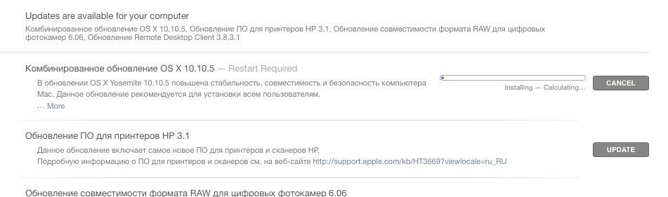 Вопрос по обновлению, стоит os 10.10.3 и ни как не хочет дальше обновляться , обновление видит os 10.10.5 но сам процесс дальше не идет, вроде как по началу запускается пишет calculating но потом останавливается и все может кто знает как справиться с этим.