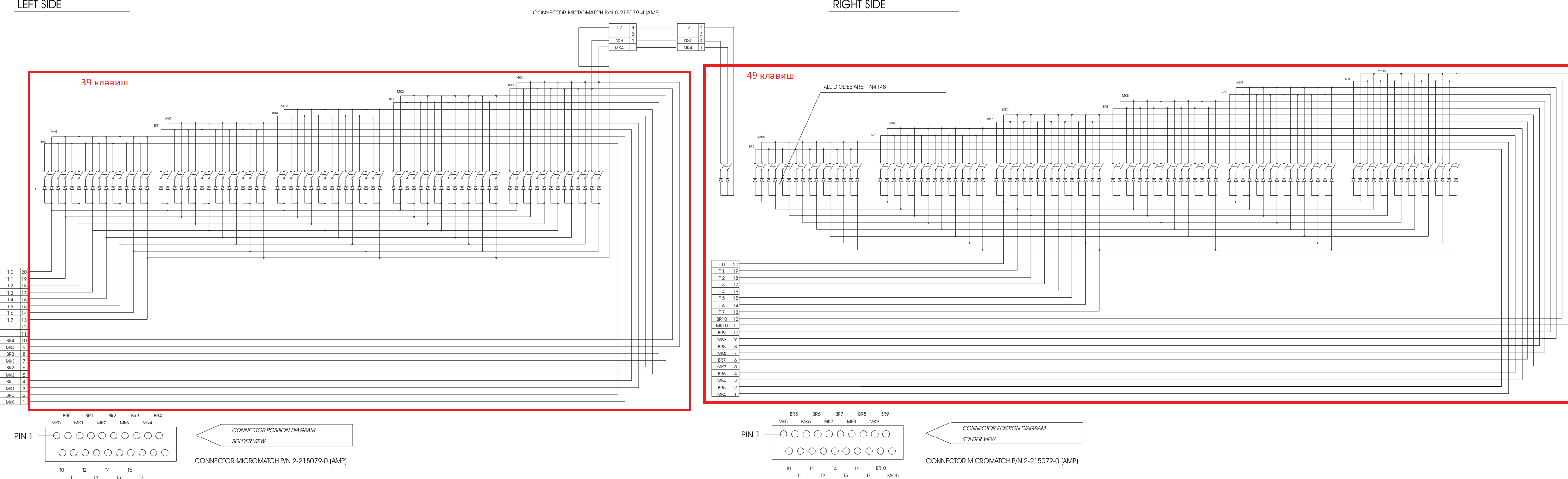 По-моему соответствует схеме Matrix_88 (кроме распиновок разъёмов на самих платах с "резинками"). Шлейфы между платами клавиш и платой "мозгов" сделаю как надо.