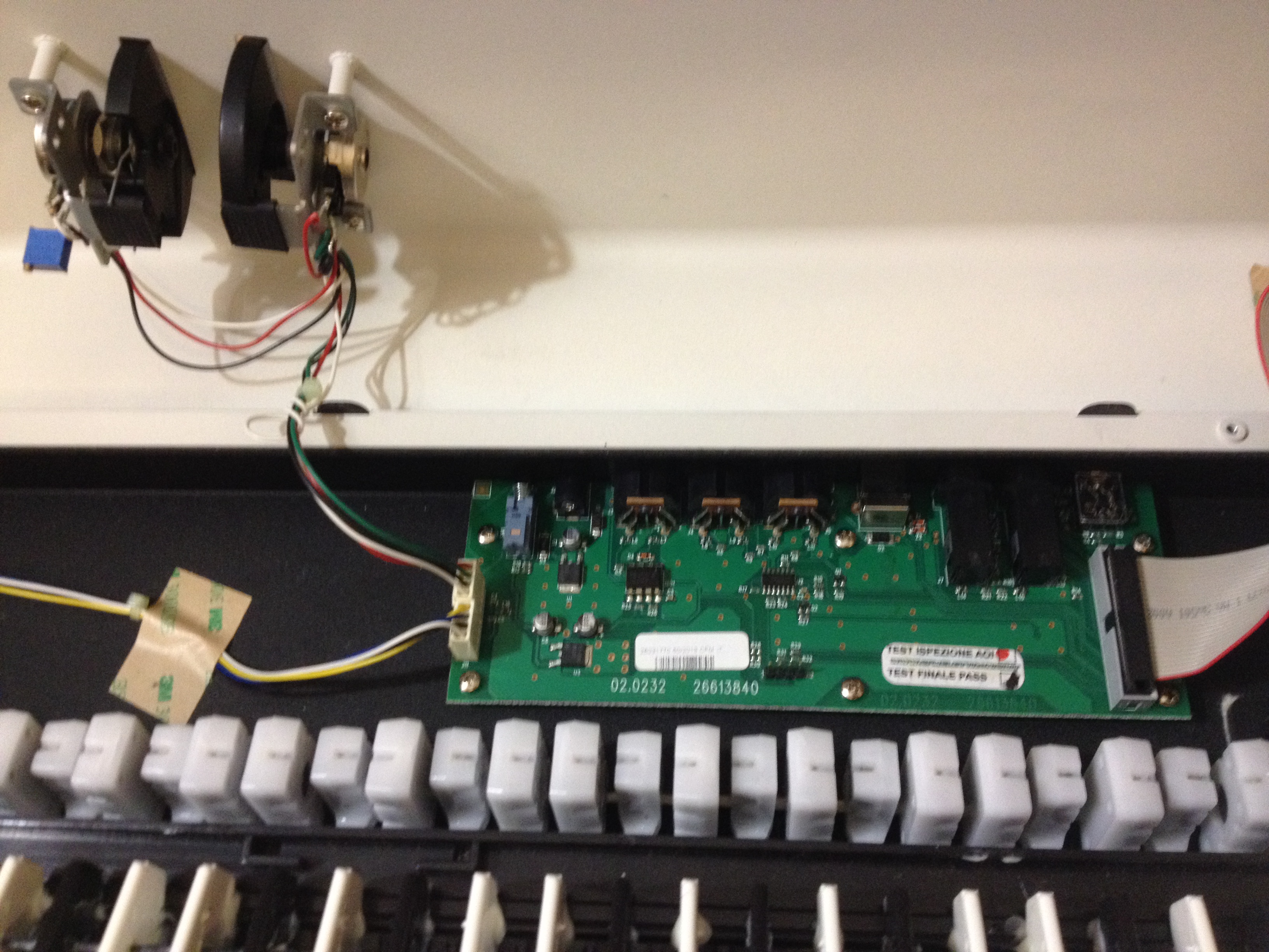 @user811, Если имеются ввиду колеса модулятора и питча, то они подключены к плате на которой установлены все подключалки...а дисплей и крутилки с кнопками возле него на другой плате, там же и контроллер установлен. Завтра попробую разобрать заново и сфоткать.