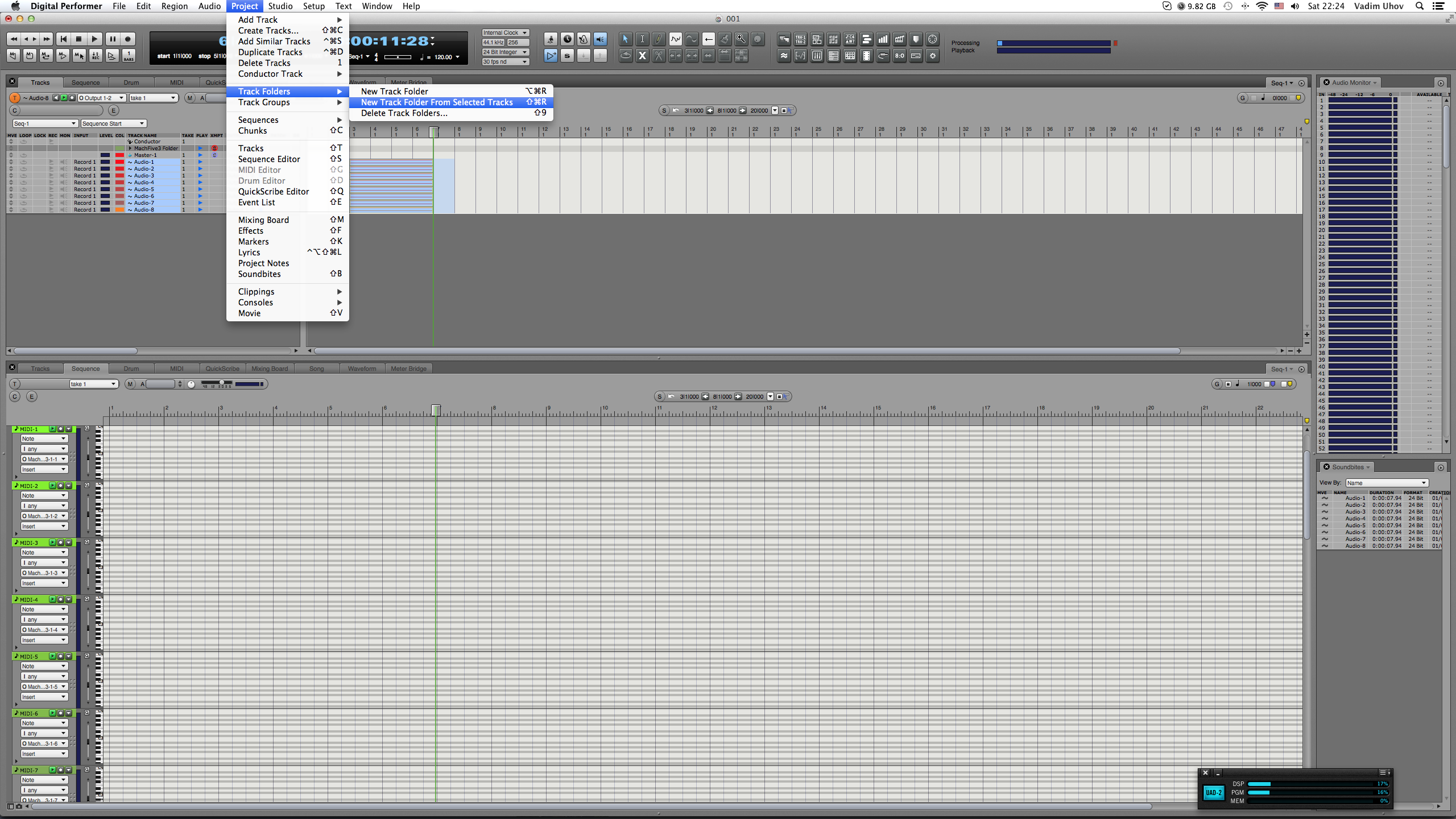 пока спасаюсь по другому . Когда "вбрасываешь" аудио из файндера дп все хорошо делает , он создает дорожку с именем , и при этом вброшенный файл выделяется сам по себе . остается только нажать вырезать и вставить , поскольку обычно курсор стоит в нужном месте то получается не нужно "ползать " по проекту , а просто нажать эти сочетания клавиш.