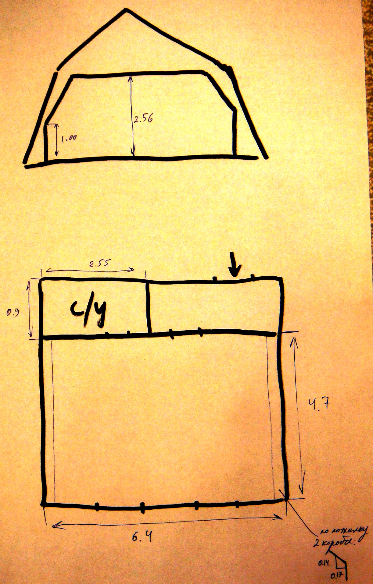 На картинке обмеры без дополнительной звукоизоляции. Где стрелка - там входная дверь, потом тамбур и сан.узел. Слева от входа будет маленькая "машинная комната" (щиток, стабилизаторы, компьютер и пр.). На противоположной стене два глухих окна (в рамы будет добавлены доп. стеклопакеты с наклонёнными наружу стёклами). Большой зал порядка 30 м2 (сейчас 4.7 на 6.4, потолок сейчас 2.56)