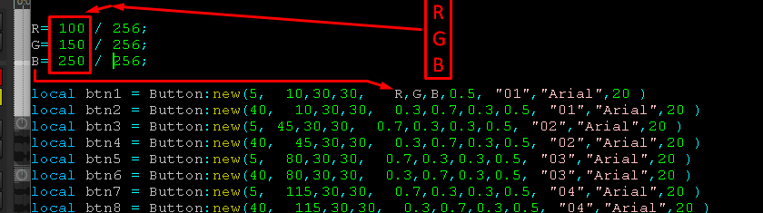 local btn2 = Button:new(40, 10,30,30, 0.3,0.7,0.3,0.5, "01","Arial",20 )