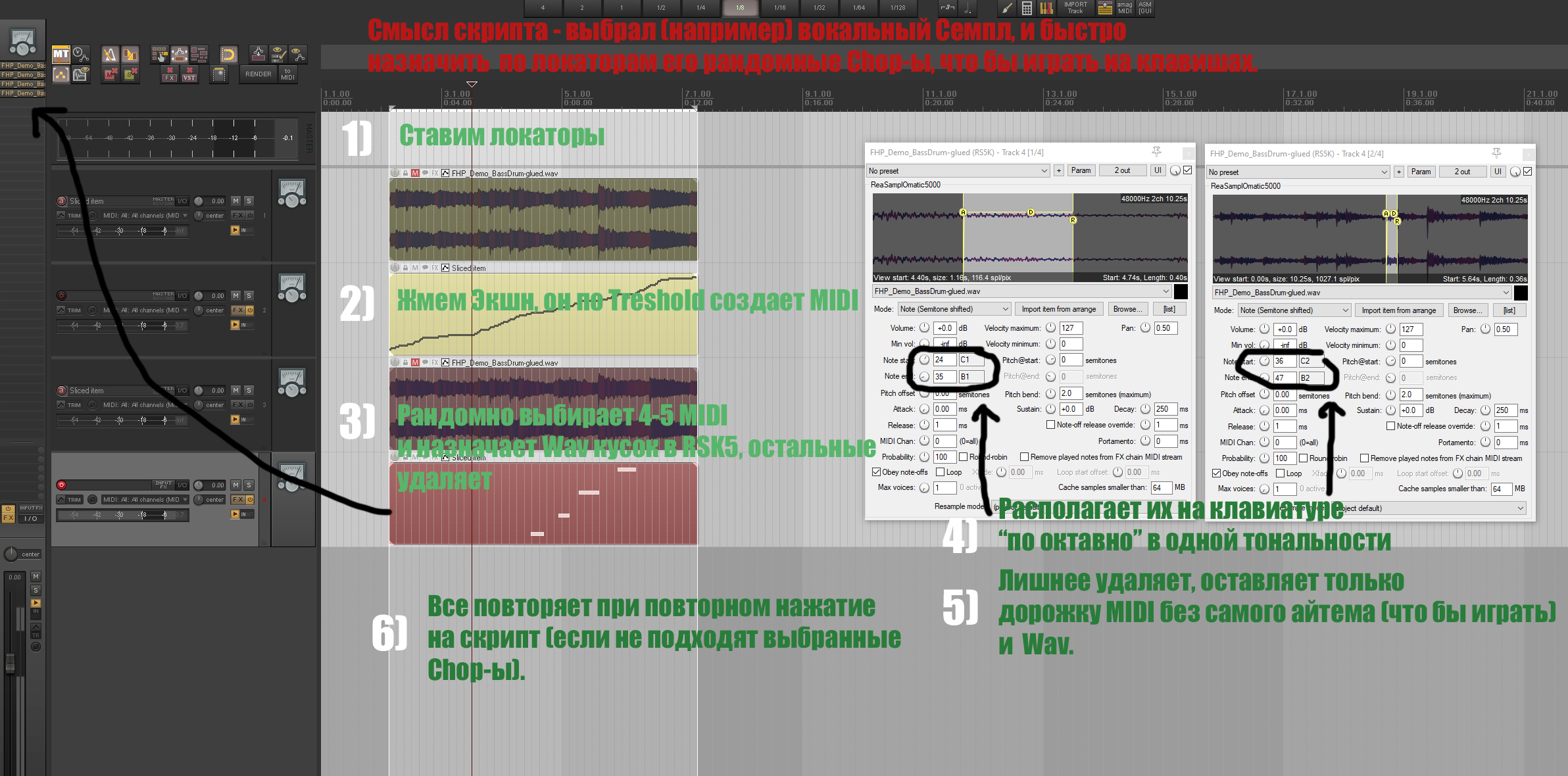 Всем привет. Подскажите, можно так сделать? На картинке постарался подробно описать суть скрипта. Или может быть есть уже такой в природе? Хочется из различных Семплов (всего скорее - вокальные) быстро создавать рандомно "инструмент" из чопов что бы играть ими на клавиатуре.