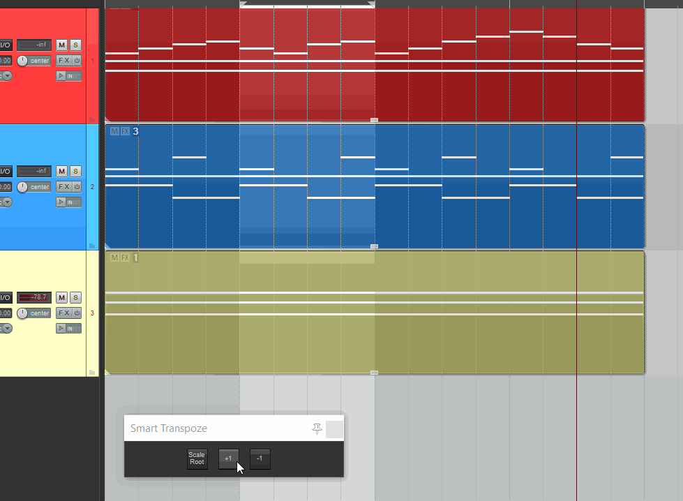 Здесь транспонирование по Scale в активном миди-редакторе,либо по Scale в первом выделенном айтеме(если миди-редактор закрыт).Транспонируются ноты в выделенных миди-айтемах.И только те ноты,старт которых попадает в тайм-селекшн.