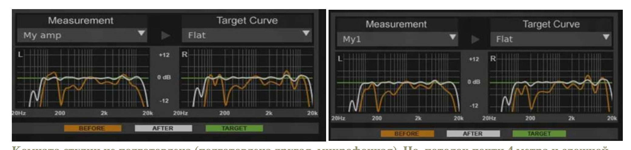 После устаноки усилителей я переизмерил комнату в 14 точках в зоне прослушивания. Получилась такая картинка (слева), справа картинка, которая снималась с другим усилителем ранее. Он такой здоровый и именитый, что сейчас валяется в гараже. Не нужно думать, что ARC сделает звук из плохих динамиков.