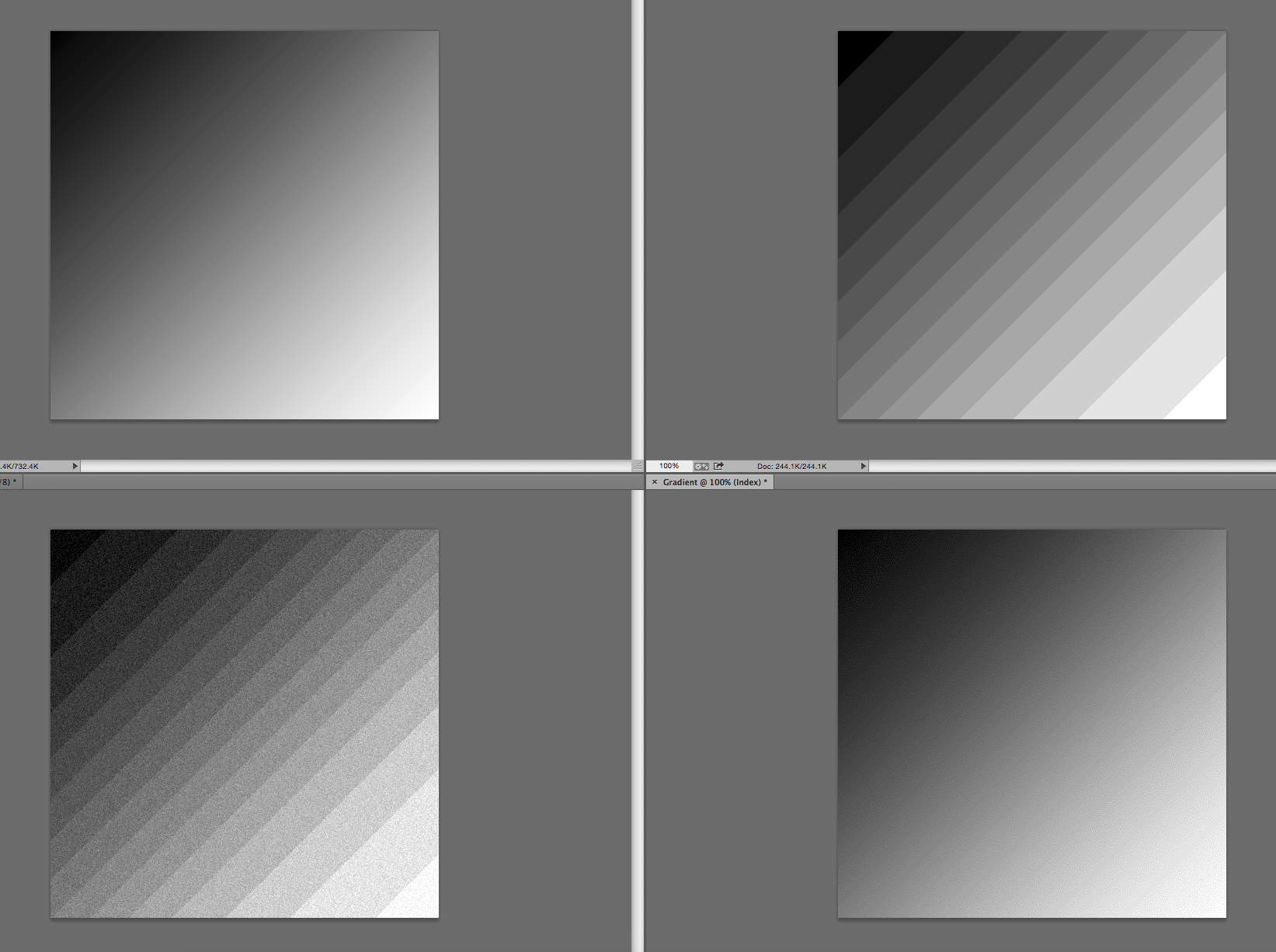 Пример. Слева плавный градиент. Потом понижение битности до 4 бит без дизеринга. Потом добавление шума после дизеринга, а последняя картинка - это дизеринг перед понижением битности