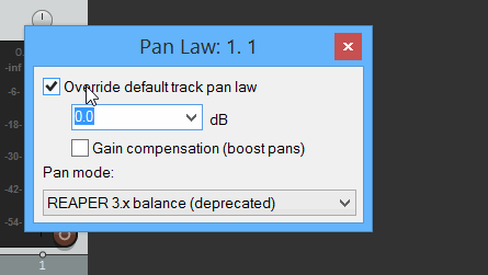 странное поведение панера при pan mod: Project default (Stereo balance) и pan law 0db - при панорамировании уровень громкости почему-то растет в промежуточных значениях (хотя должен быт постоянен от центра до крайней точки), если же выставить pan mod: REAPER 3-x panner(deprecated), то все нормально, хотя они не советуют использовать deprecated