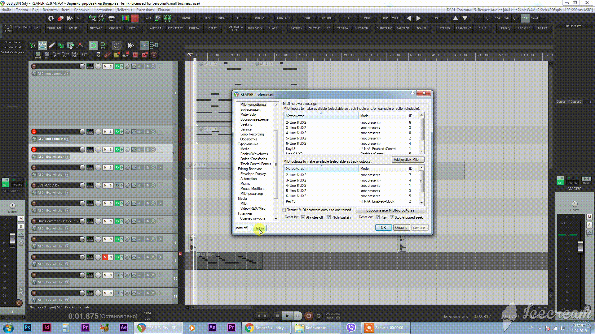 Ещё обратил внимание, что зависания бывают тогда, когда на миди дорожках установлена опция Automatic record-arm when track selected. После того, как я от неё отказался, количество зависание уменьшилось в разы. А вообще, это больной вопрос в Рипер и пока нерешённый - зависания мидинот продолжаются несмотря на все проставленные галки.