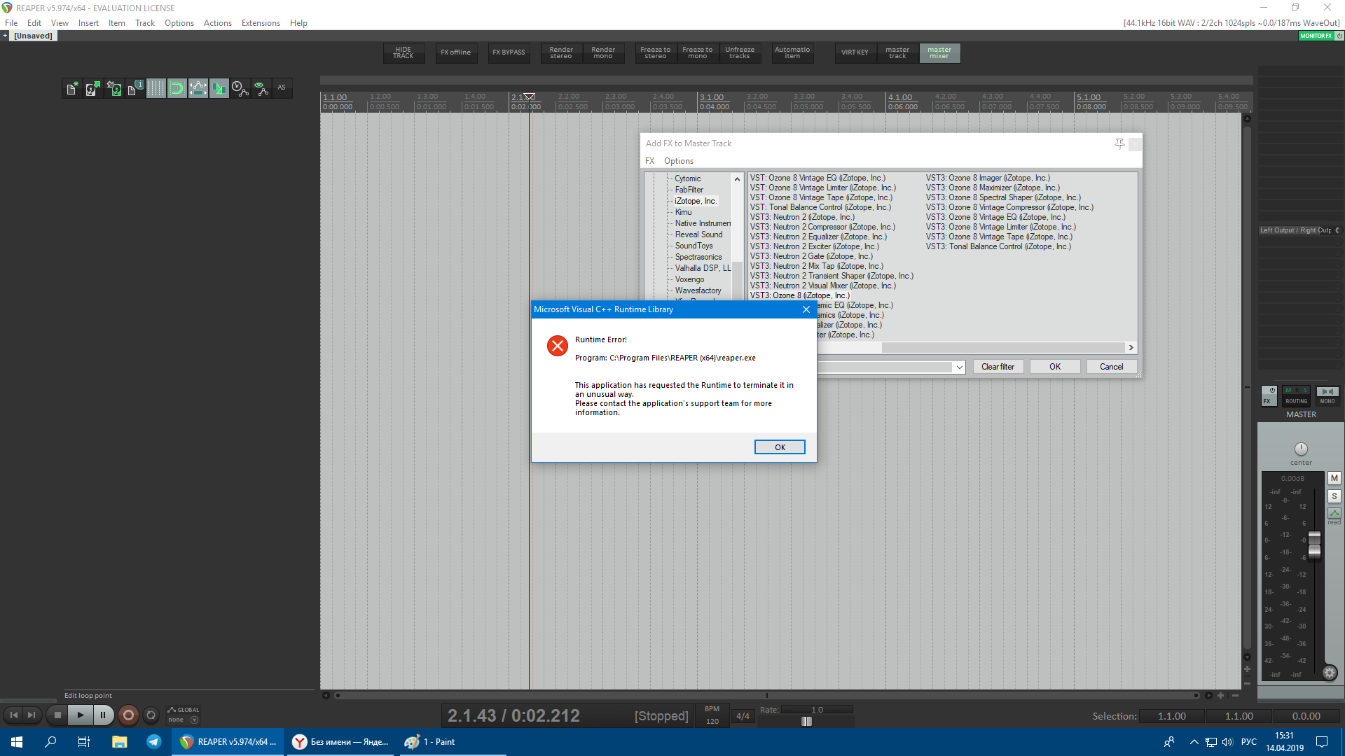 Привет всем! Такая проблема - около двух недель назад вдруг перестали загружаться плагины от Изотопа, Озон и Нейтрон, с сообщением как на первой картинке. Выяснил что надо обновить Майкрософс Визуал С++. Обновил. Теперь эти плаги на дефолтном рипере загружаются нормально, а на моем конфиге нет. Причем, если загружать мой конфиг, но галку с первой опции убирать, это на картинке номер два показано, то плаги снова работают. Может кто сталкивался или просто знает что сделать?