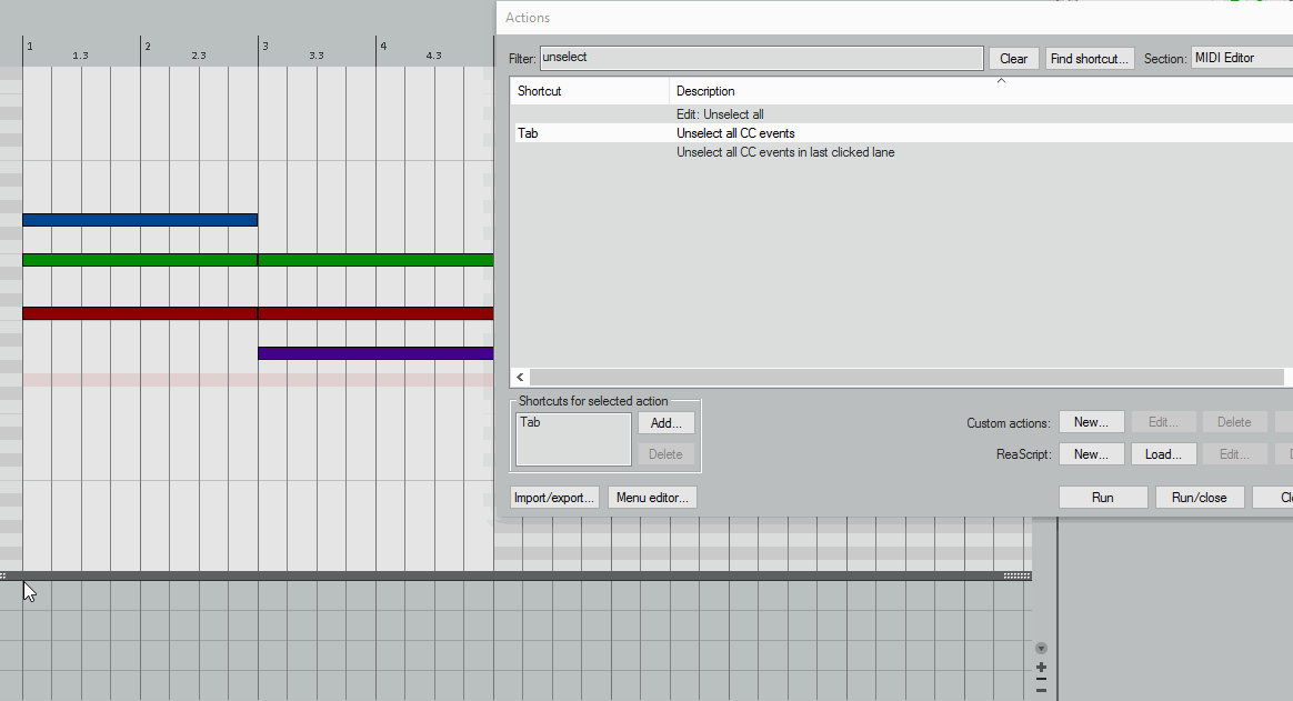Например, есть некие аккорды. Добавляем нажатия на педаль. Теперь какую бы ноту из этого аккорда не выберешь, всегда выделяется и событие нажатия. Чтобы решить проблему назначил Unselect all CC events клавишу. Вроде теперь можно нормально мютить, удалять ноту. Но при перемещении этой ноты все равно передвигается и само событие нажатия на педаль.