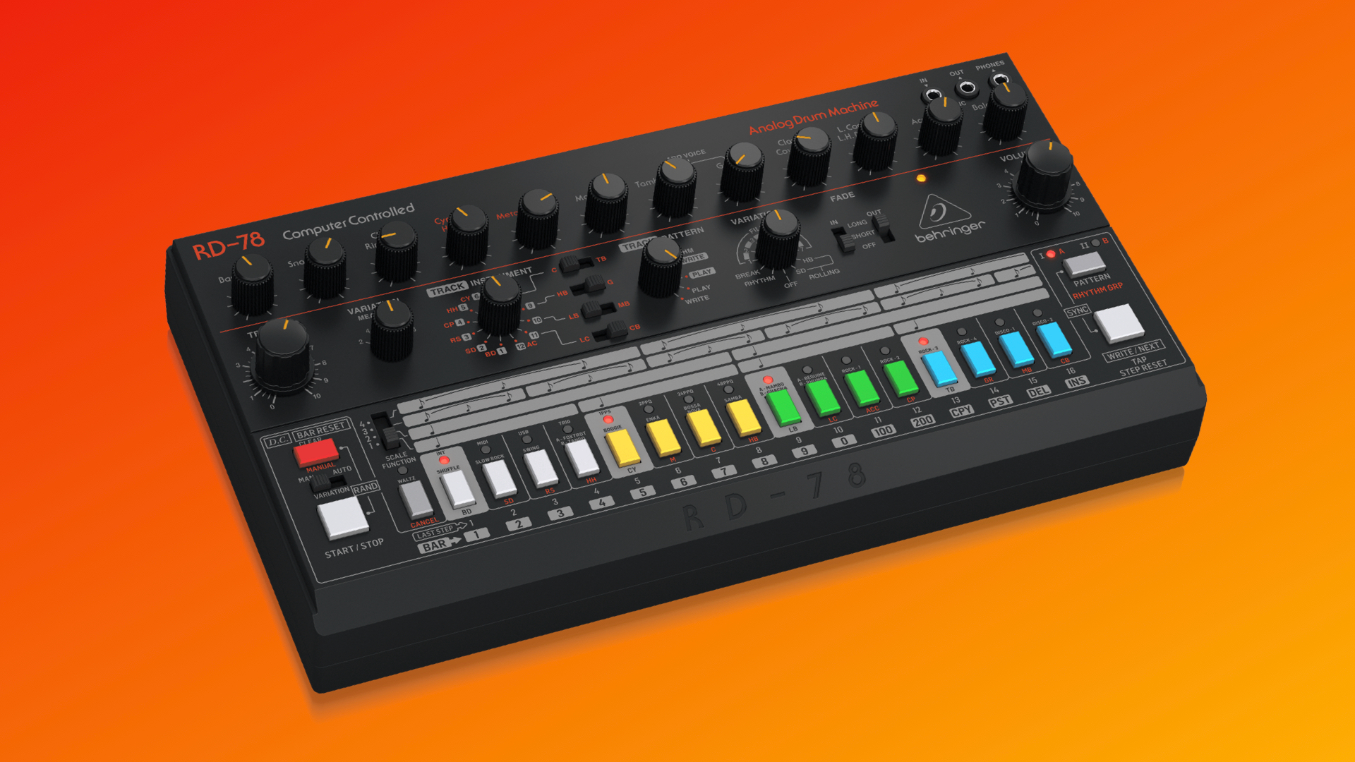 • 16 authentic-style step buttons with LED indicators for easy pattern creation