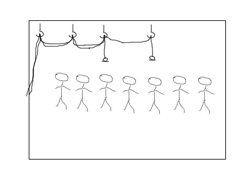 Что ж тут тапками кидаться. Нормальная схема для подходящего случая. Только случай неподходящий. Зрители-то не сбоку сидят. Часть из них прямо на линии огня- тоже попадут в сигнал. Да и расстояние нужно между микрофонами не маленькое- иначе весь низ будет потерян.