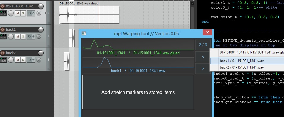 Сейчас мы делаем расширение для Рипера - менеджер/апдейтер скриптов. Для этого в своём дистрибутиве пришлось переименовать скрипты, добавить шапку к каждому. Всё, что было в тестовой папке, перенёс в тестовый репозиторий ReaScript-Test (также в открытом доступе), найти можно в моём гитхабовском аккаунте. Warping tool пока оставил, неудобно с ноута его писать, да и пока до нового года другими делами занят.