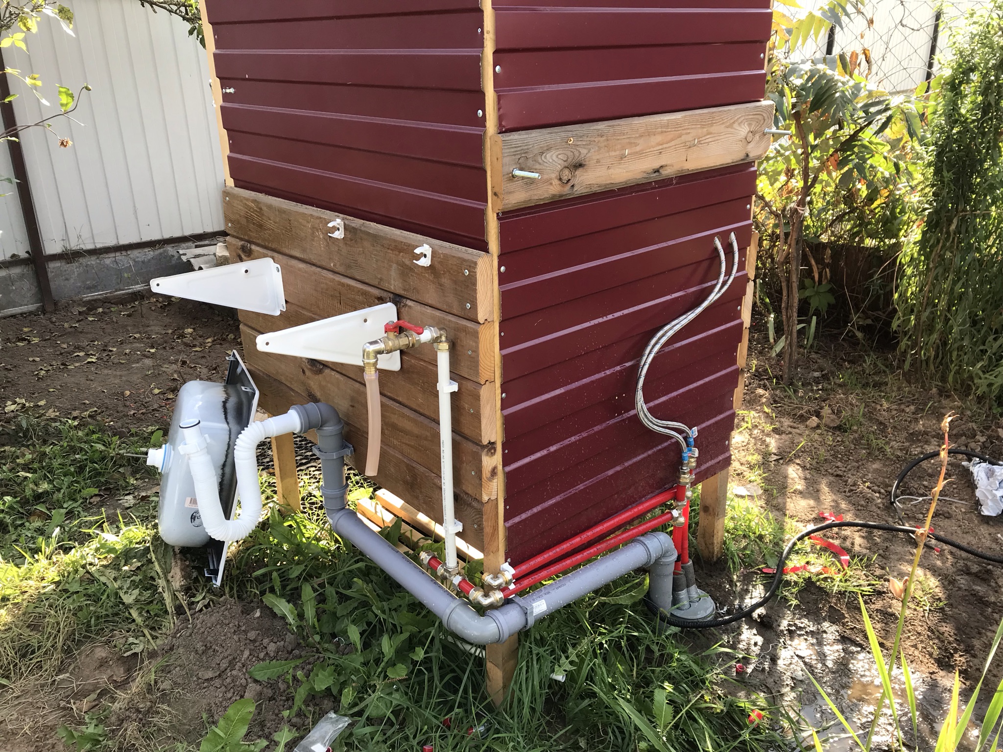 Когда я проводил на дачу воду и обустраивал водяную инженерку, то сразу проложил в траншее закладной канал - между домом и временным летним душем (на месте которого в ближ.годы планируется возвести небольшой гостевой домик).