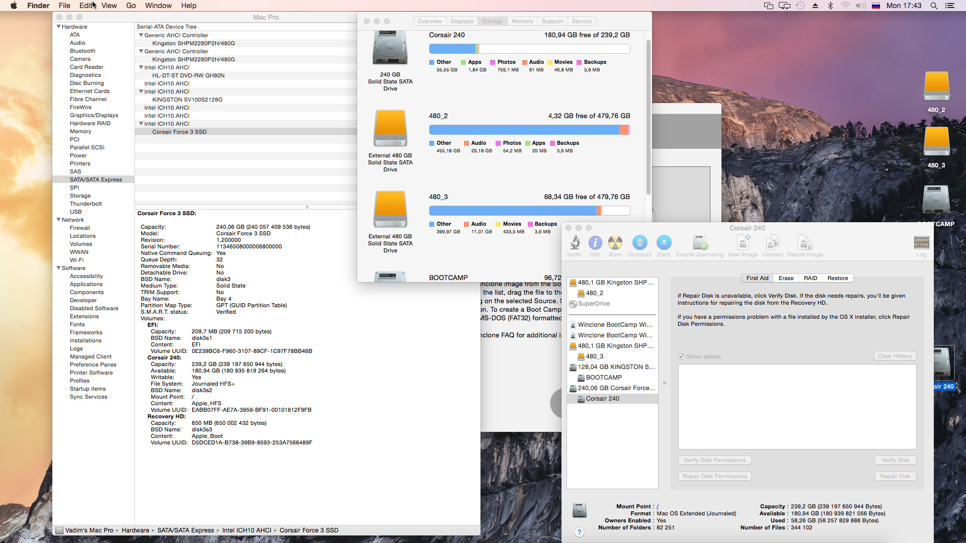 Да, ещё дополнение, все диски кроме системного отформачены в HFS+, стоит драйвер Paragon, купленный. на то 2 причины - периодически надо под маком запускаться, чтобы виделось, плюс, в таком виде чтение происходит быстрее, чем с NTFS (парадокс)