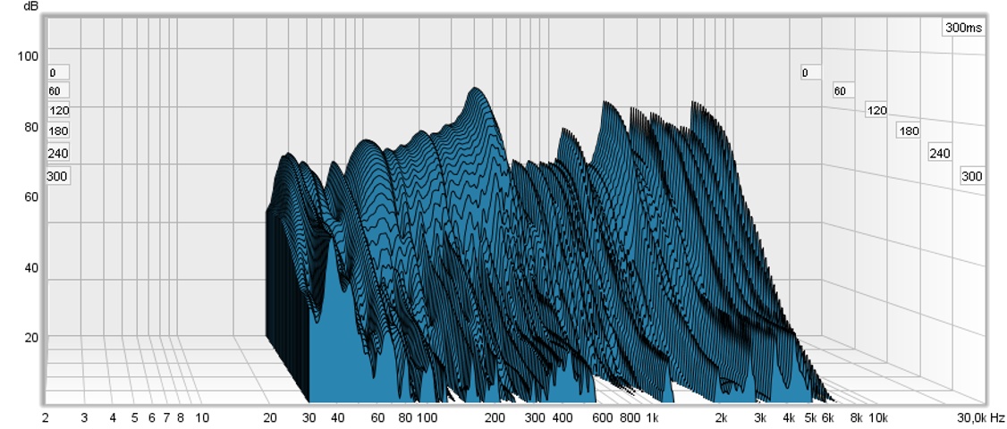 Комната Высота-2700, ширина-2300, длина-4000. Стены обшиты панелями МДФ. Измерил частотную характеристику (Room EQ, микрофон ECM800) и получил вот такой результат.