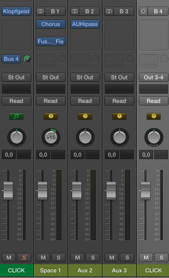 Попробовал сделать посыл на шину, назвав ее Click и создать ей выход на Output 3-4 - помогло но стандартный канал Klopfgeist'а все равно остается на Stereo Output