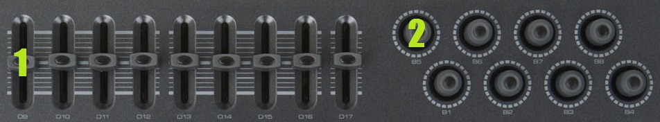 Т.е. слушаем трек, решили, что надо изменить громкость первого канала, выбираем микшер и первым регулятором (рис.1) производим настройку. Далее, надо изменить атаку в синтезаторе, выбираем синтезатор и первым регулятором (рис.1) производим настройку. И, затем, решаем изменить параметры LFO второго синтезатора, где выбираем сам синтезатор и регулятором 2 (рис.1) производим настройку.