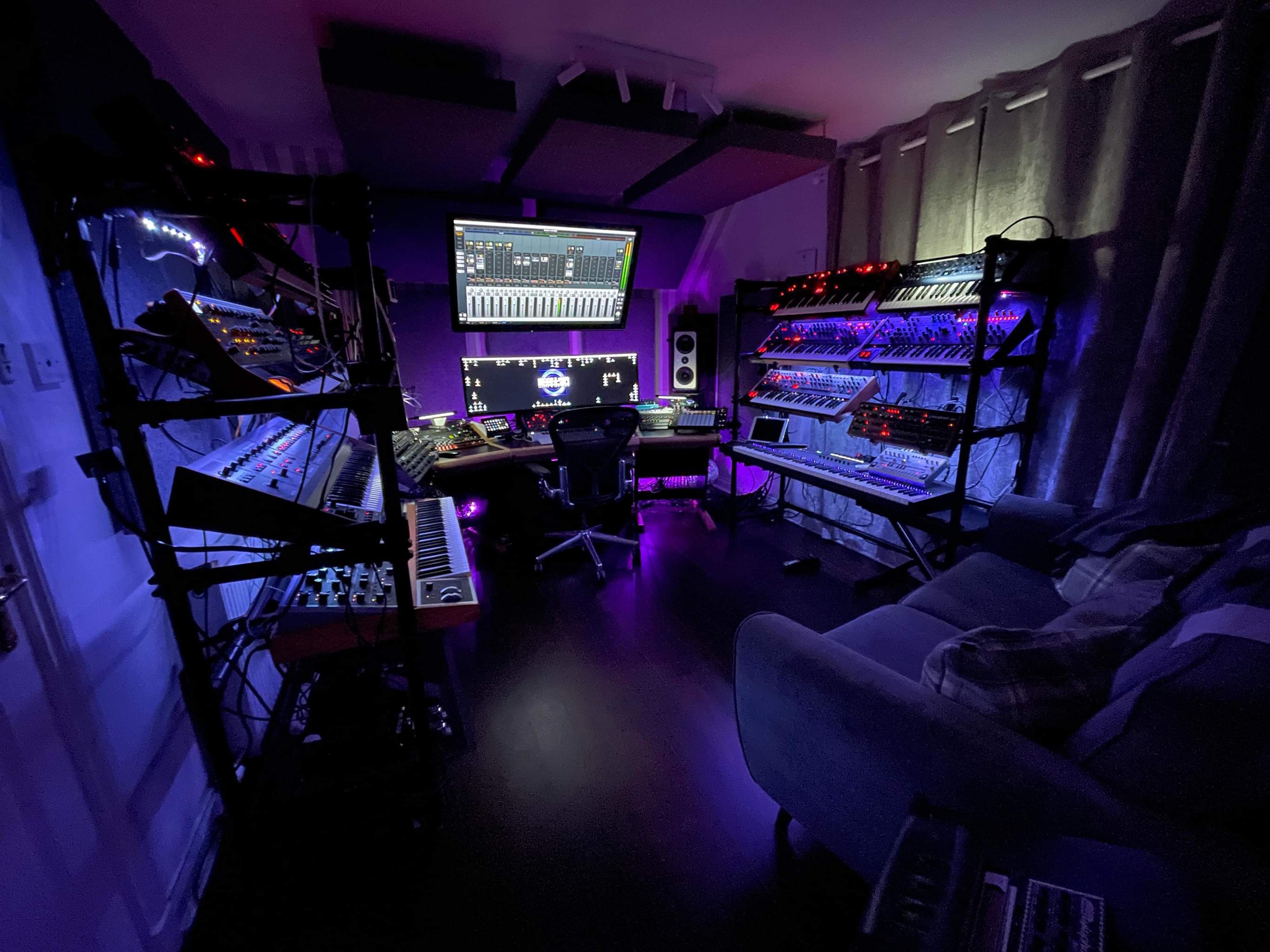Количество синтов - непредсказуемо. Может быть целиком микс из софтовых синтов и сэмплов, с тонной плагинов. Или пара синтов железных (и один - с его родным цифровым (!) ревером) и драм-машиной. Чаще всего, пара железных, три-пять софтовых и сэмплы с хитрым лэерингом. Или просто партия оркестровки. Enigma, как говорили древние…