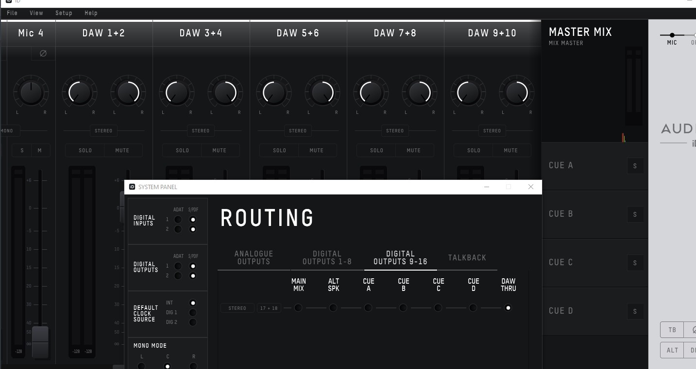 Добрый день! отдаю по spdif по оптике 2а сигнала, на 2а устройства в микшере есть daw 9-10 и в системной панели stereo 9-10(всё ок),но нет в микшере выходов 17-18..где-то спрятано или пошивка такая? и отдать сигнал с 17-18 могу только напрямую с DAW?.