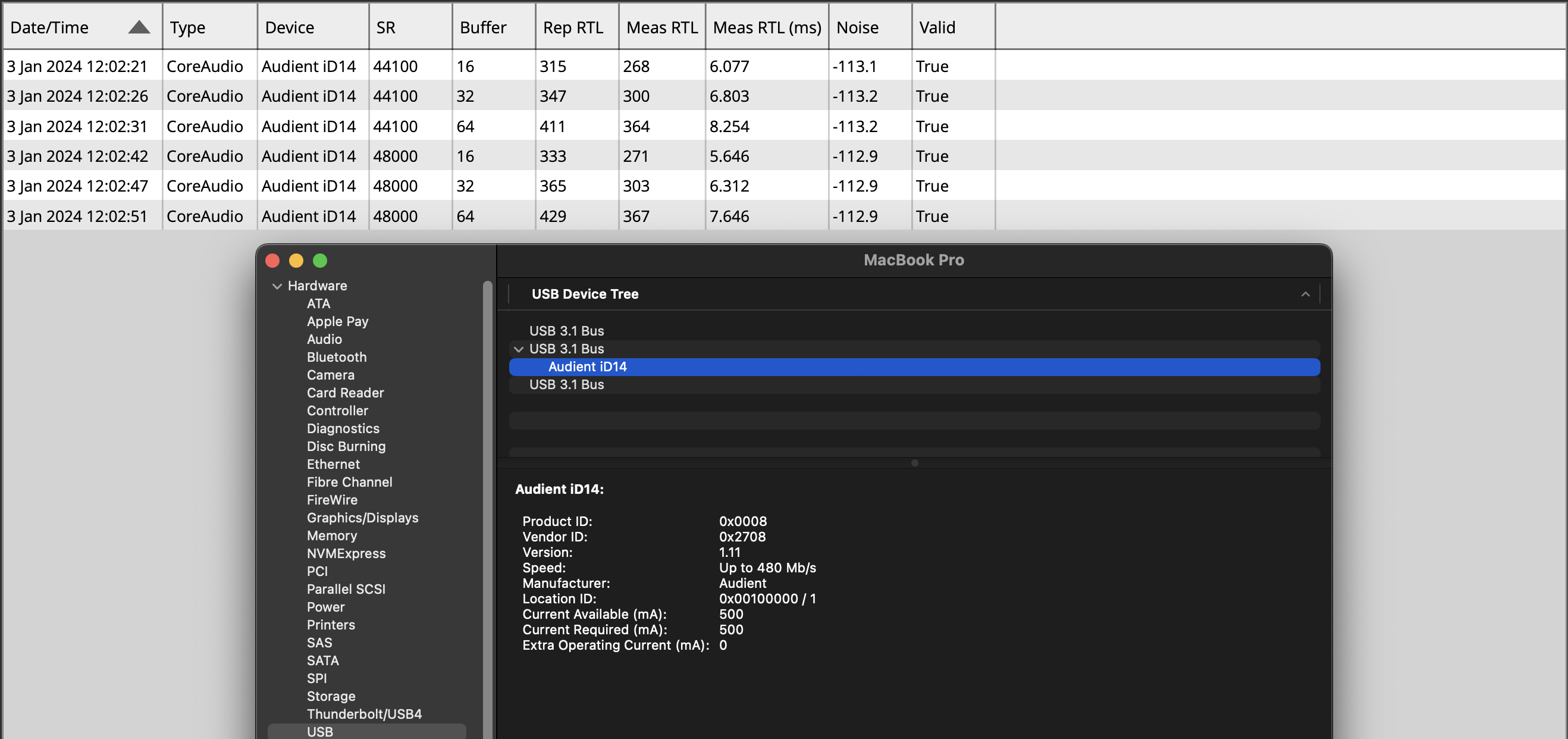 не прокачали аудиенты по задержкам для macOS в отличии от motu. кстати, подключил двумя кабелями – хороший TB4 и обычный USB2 через адаптер. в результате и задержки отличаются и шум.