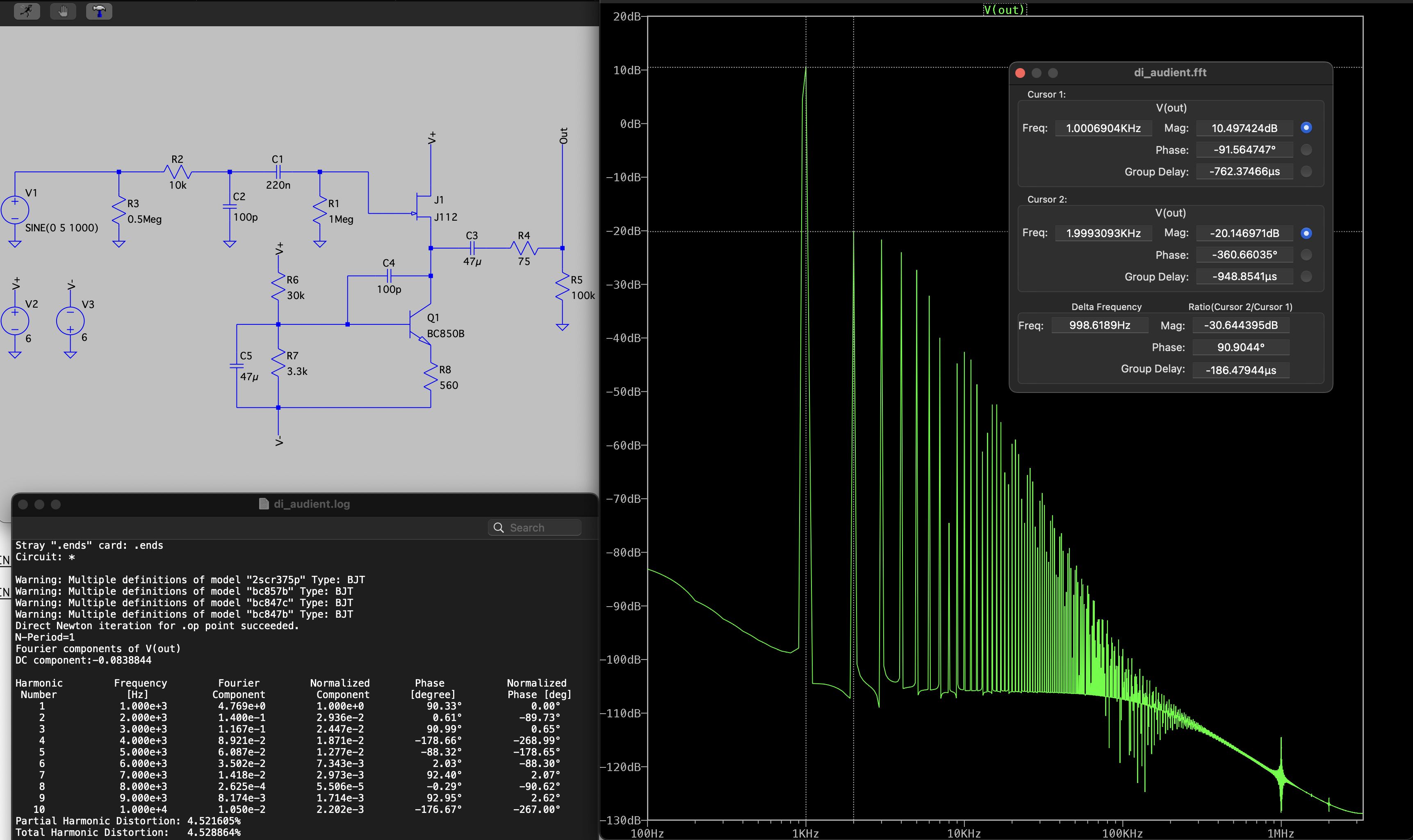 на днях баловался симуляцией схемы DI-входа в картах аудиент из их же сервис-мануала. Подавал на вход синус и смотрел форму волны (КУ), а также THD с АЧХ.