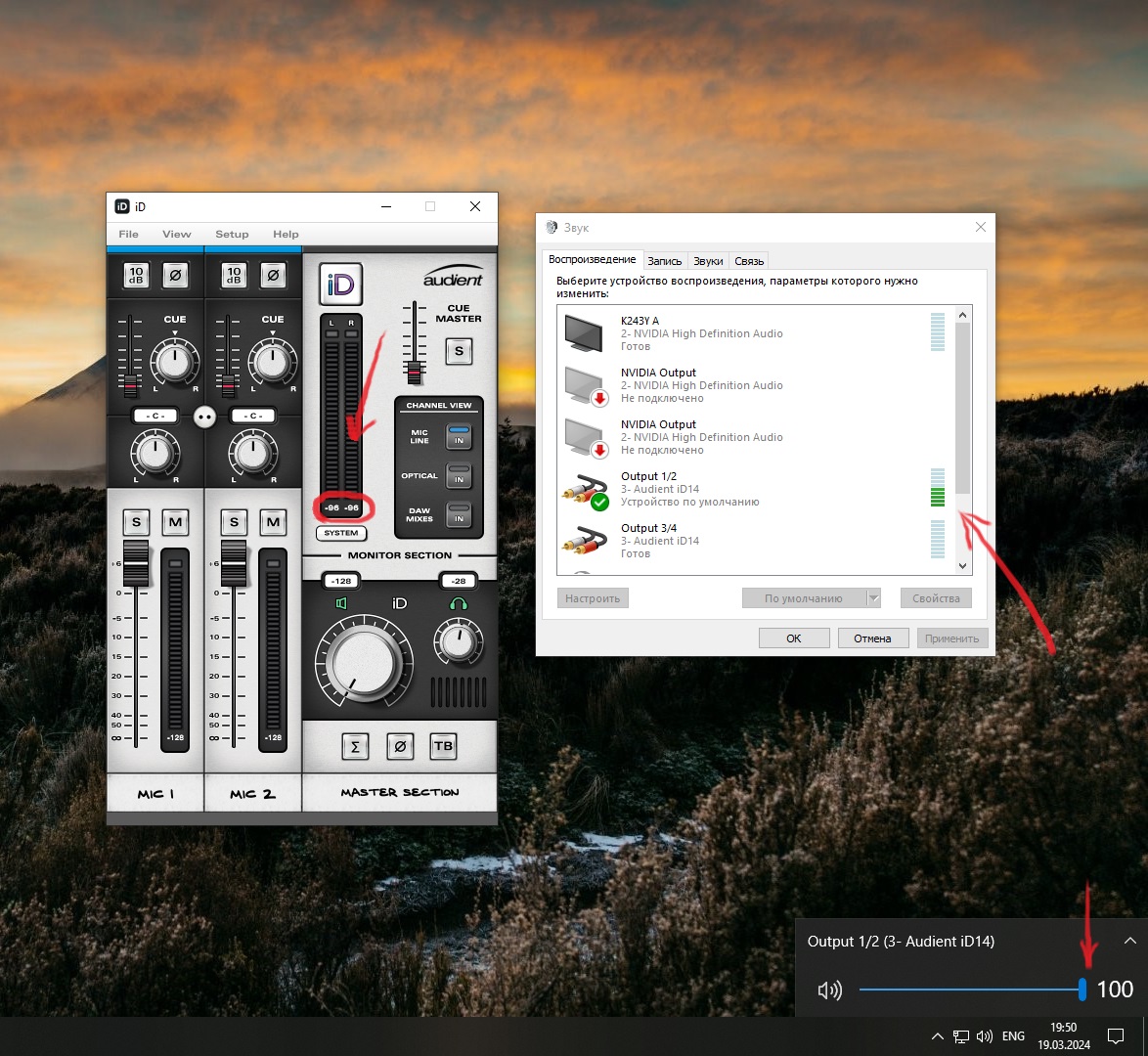 4) Сам компьютер в iD контроллер не отдаёт громкость на выход, звук ни из одного приложения не слышно в наушниках, при том, что в устройствах воспроизведения видно, что на аутпут наушников звук якобы идёт и реагирует.