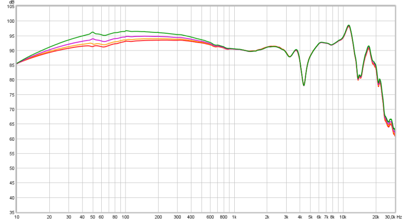 Instead of showing impedance plots, which are hard to ‘read’ when it comes to assessing the tonal balance change in the real world, the DT 900 PRO X is measured via a few different resistance outputs (0.2Ω, 10Ω, 32Ω and 120Ω). On a higher output resistance amplifier the output level will be lower of course due to voltage division. To compensate for this the amplifier is cranked up to the same level (10.9dB for 120Ω at 1kHz in this case). This way the plots are overlaid and it is easier to see how the tonal balance changes. Output resistances between the mentioned resistance values will result in tonal changes between those traces."