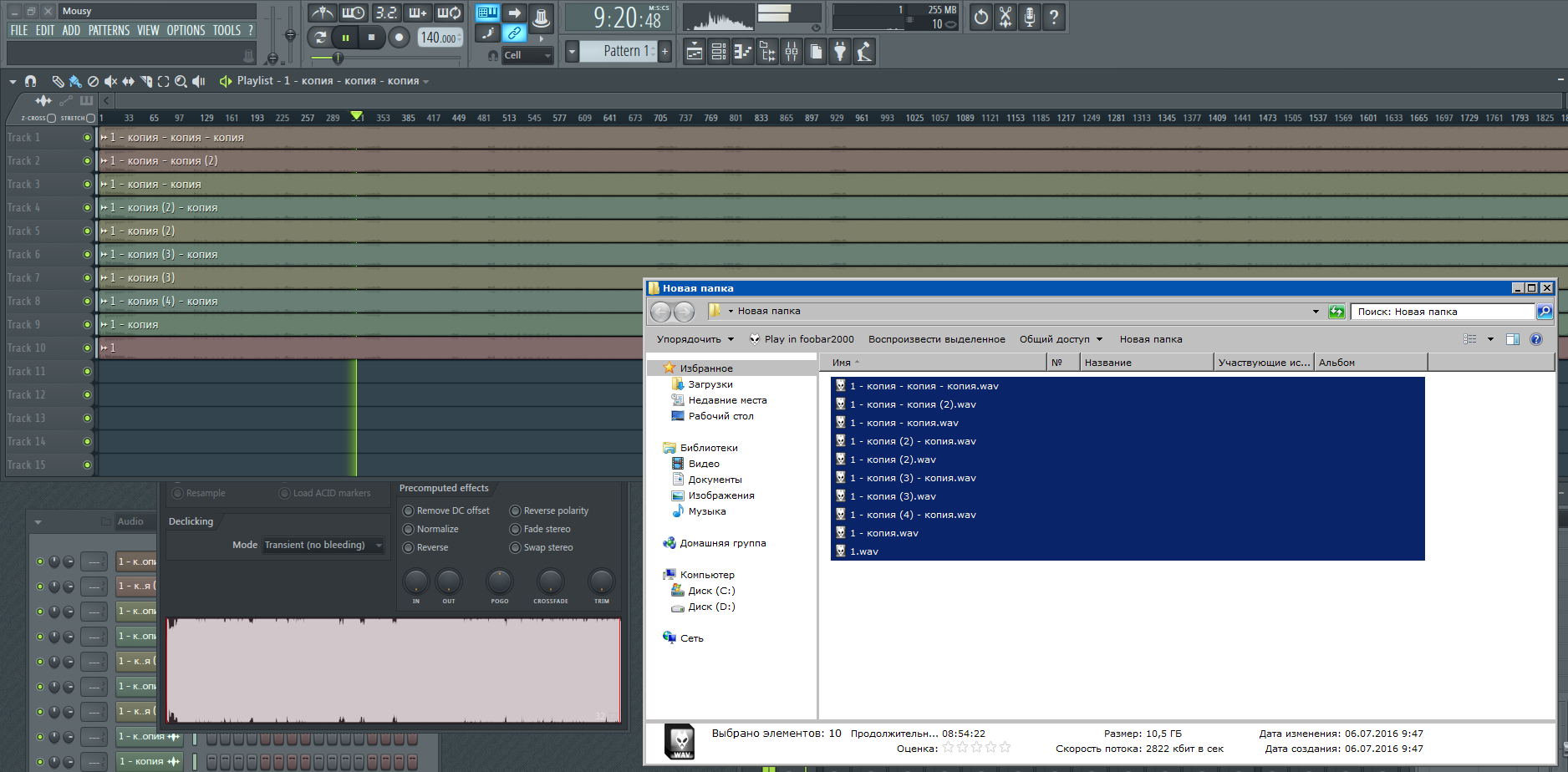 Несжатое аудио будет читаться с диска. Для сжатого аудио большого объема, будет необходима 64-битная версия FL и достаточный объем оперативной памяти. В обоих случаях, для длительного аудио, дополнительное время уйдет на формирование графического отображения осциллограмм. Задержка, связанная с отображением осциллограмм, может возникнуть пару раз. Для сжатого аудио, распаковка может занять длительное время. Следует перетащить сразу все файлы в плейлист, чтобы можно было откинуться на спинку кресла, пока компьютер трудится. :) При работе с несжатым аудио, по крайней мере 12 версия FL не требует совпадения частоты дискретизации, так как ресемплирует на лету, в соответствии с общими настройками интерполяции. Для большого количества дорожек может потребоваться много ресурсов для ресемплирования, иначе придется поставить галочку ресемплирования у каждого аудиоклипа, нужно будет дождаться полного ресемплирования, при котором все аудиоклипы будут помещены в оперативную память. При некоторых операциях с аудиоклипами, например, при различном растягивании, может потребоваться их помещение в оперативную память.