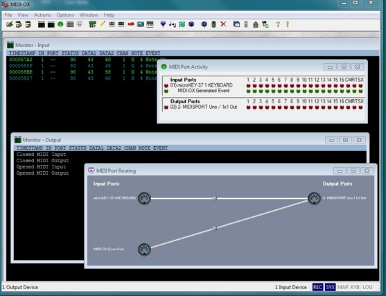 Почему-то нет сообщений в окне Monitor-OUTPUT... (имеется в виду нажатие нот) ... хотя команды фактически идут, светодиод выход МИДИ интерфейса мигает, и синт подключенный к нему - звучит. Мне же нужно видеть визуально код на выходе... Роутинг простой - 2 устройства. Start display - включен. Фильтров нет.