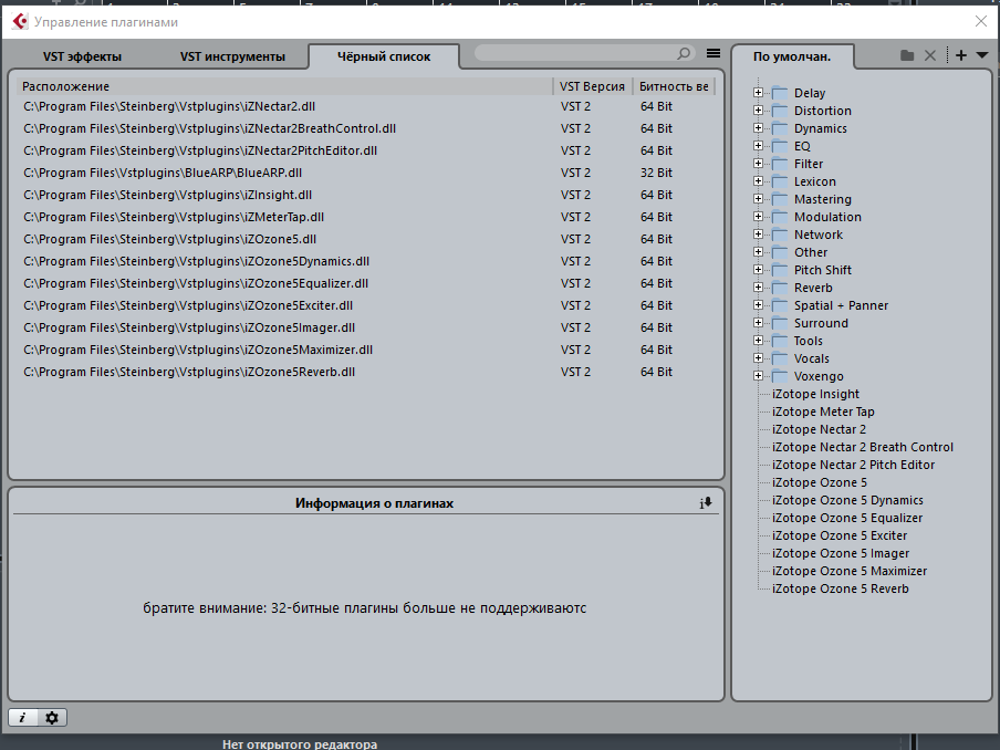 У меня в черном списке плагины 64 битные. Пока не понял что к чему, буду разбираться. а 32-битного плагина моего железного синта Korg M3, нет вообще нигде!